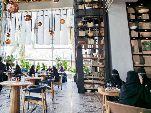아래 사진은 같은 건물의 카페에서 브런치를 먹고 있는 여성들입니다. 오른쪽 아래를 보면 여러 명이 모여있는데 모두 니캅(niqab)을 쓰고 있습니다. 음식을 먹을 때는 저 니캅을 들고 다른 손으로 먹는답니다. 그러나 무슬림들은 꾸란이 여성이 히잡이나 부르카를 의무적으로 착용해야 한다고 규정하지는 않는다고 믿습니다. 즉, 얼굴이나 눈을 가리는 것은 종교적 이유에서라기 보다는 각 집안의 전통이나 남편의 생각에 따라서 주로 결정이 된다고 하네요.