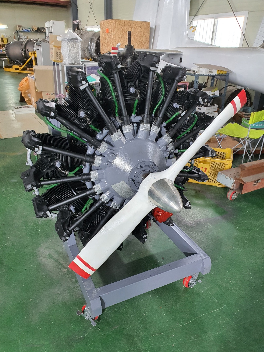 그 다음 평가 유물에는 항공기 엔진이 있다. 초기 항공시대에는 모두 피스톤 엔진을 사용했다. 대표적 내연기관 엔진이다. 엔진의 열을 공기의 접촉으로 식히는 공랭식 엔진이다. 현재 육상과 해운에서 작동되는 엔진은 거의 대부분 피스톤 엔진이다. 피스톤 엔진이 운송수단에서 차지하는 부분은 이처럼 대단하다 할 수 있다. 피스톤 엔진은 통상 시린다 수에 따른 분류를 한다. 시린다 수가 처음에 4개짜리가 있었고 이후에는 6개로 늘어났다. 배기량이 커진 것이다. 주로 수평대향형(horizontal opposed) 엔진이라 부른다. 짝수의 시린다 개수를 가졌다.