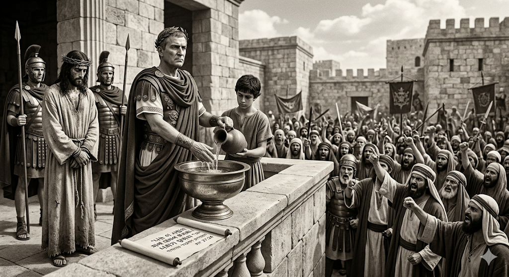 그는 예수 그리스도의 죄가 없다고 판단했음에도 불구하고 군중의 압력에 굴복해 예수를 십자가에 목 박히도록 허용했다. 그리고 도덕적 책임을 회피하기 위해 군중 앞에서 ‘손을 씻는’ 행위를 보여준다. 비겁과 무책임의 극치를 보여주는 것이다.