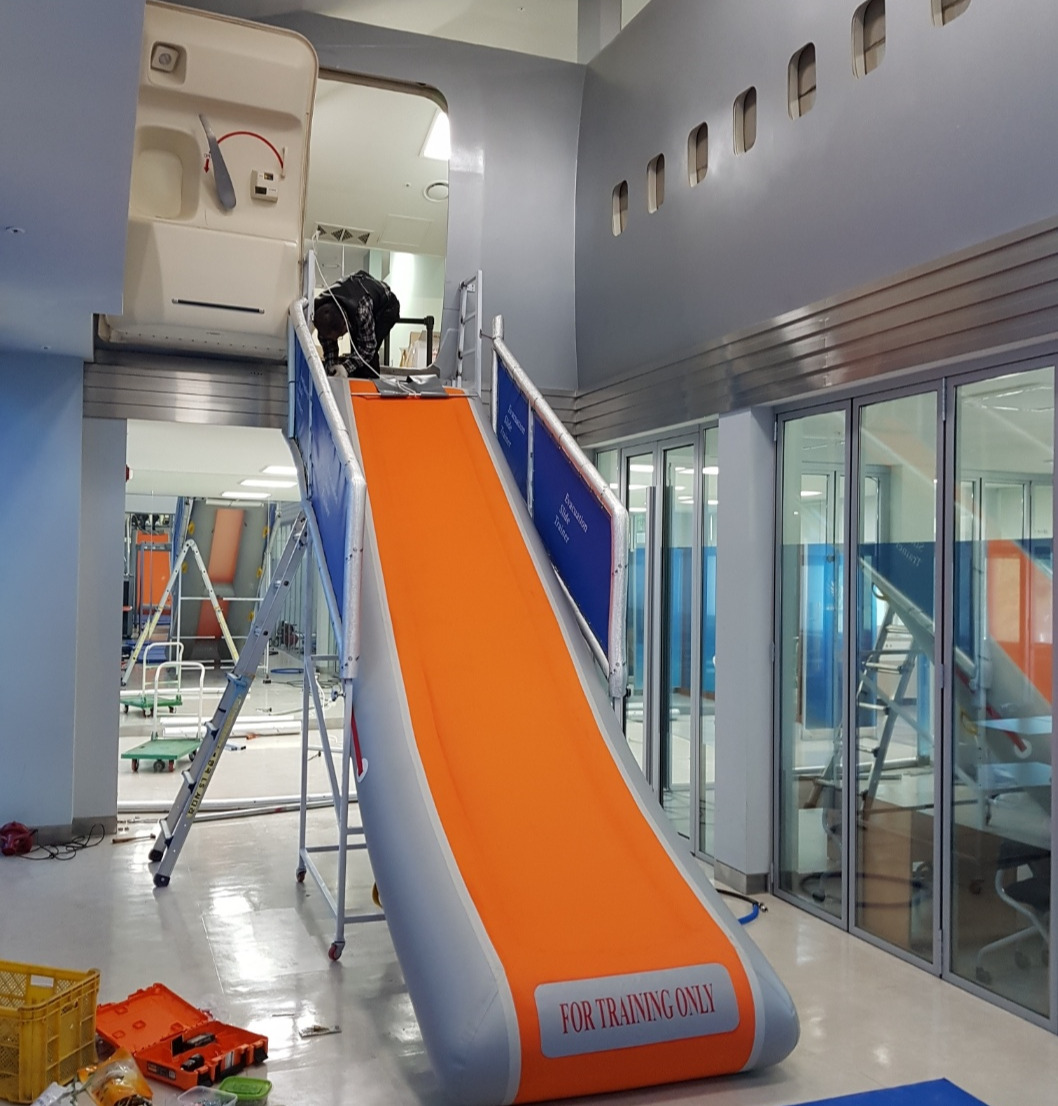 우리 회사에서 국내에 약 10 군데 이상의 대학과 LCC 항공사에 이런 비상탈출 슬라이드와 보호매트를 설비하였다. 항공기에 탑재된 비상탈출용 미끄럼대는 단지 일회용이다. 항공기 사용연한 내 비상상황이 발생하면 단 한번 쓰고 버리는 용도인데 그래서 재질도 아주 얇고 가볍게 만들어 항공기의 비상구 하단에 적재해 둔다. 그래서 모든 항공기의 비상구 문은 하단부가 툭 튀어나와 마치 임산부를 연상시키기도 한다. 비상훈련용 슬라이드는 일회용이 아니고 여러 번 사용하기 때문에 두꺼운 재질로 안전하게 만든다. 실제로 탑재되는 항공기용과 아주 흡사하게 제작하여 대학 등의 훈련시설에 제작하는 일을 우리 회사가 가장 많이 행한 것이다. 이번에 한 일은 바로 그러한 작업이었다.
