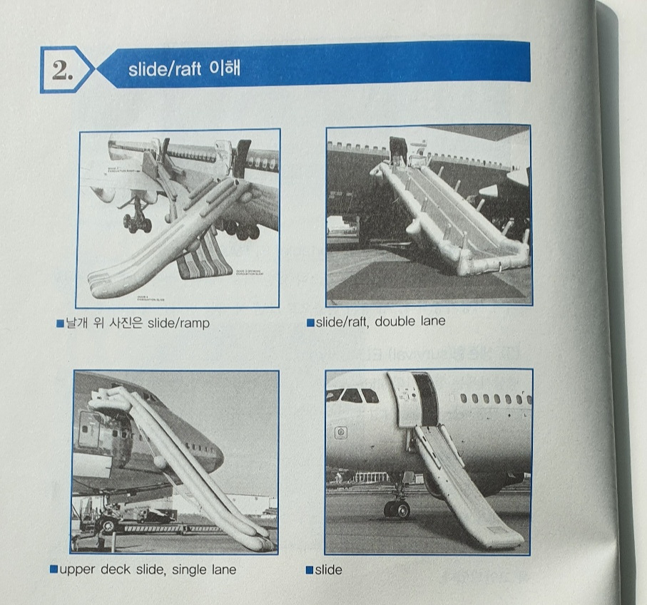 자, 지금까지는 실제 항공기에서 비상이 발발했을 때 승객들이 비상 탈출구를 이용해 항공기 외부로 가장 신속히 벗어나는 이론에 대해 이야기를 했다. 항공기 객실 승무원들은 이런 상황이 도래했을 때를 대비하여 철저한 훈련을 해 두어야 한다. 항공안전법에 의한 필수 훈련이다. 연 1회 정례 훈련에 패스해야 유효한 훈련 필증이 나오는데 만일 통과하지 못하면 다시 훈련을 해서 합격이 되어야 비행근무를 행할 수 있다. 따라서 모든 항공사는 이러한 훈련 시설을 구비해 두어야 했다. 대형 항공사와 일부 LCC 항공사들은 당연히 자체 훈련 시설을 갖추고 있다. 자체 시설을 구비하지 못한 일부 LCC 항공사는 부득이 항공서비스학과가 있는 대학교와 협업하여 대학 내에서 비상훈련을 한다. 보유하고 있는 항공기에 비치된 것과 동일한 비상 탈출용 슬라이드 를 이용하여 항공기와 가장 유사한 조건에서 비상탈출 훈련을 한다.