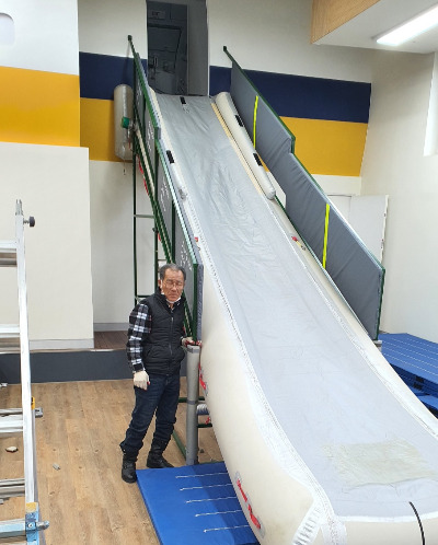 이번에 내가 시설을 만들어 준 항공 탈출용 슬라이드 보호막은 에어버스 소형 항공기를 위한 것이다. 기본 높이가 3.6M에 달했는데 지금껏 보호막 없이 슬라이드만 설치되어 안전을 위해 슬라이드용 안전 보호매트를 양옆에 설치하는 작업이다. 실제 항공기에는 없는 장치인데 이는 순전히 비상 훈련을 하는 승무원 안전을 위해 설치해야 했다. 모든 항공사가 안전훈련을 위해 유사한 보호장치를 하는데 주위에 안전 그물망을 친 시설도 있고 또 주위에 보호용 매트를 푹신하게 쌓아 놓기도 한다.