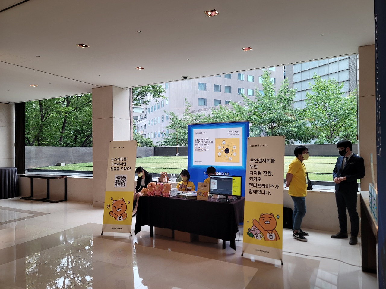 입구에서는 카카오 엔터프라이즈의 행사가 진행 중입니다. 뉴스레터를 구독하면 선물을 제공하는 행사인데요, 손가락 까딱 몇 번이면 귀여운 카카오프렌즈 캐릭터들을 손에 넣을 수 있는 기회였습니다. 낯을 가리는 저는 용기를 내지 못하고 바라만 봤어요(..)