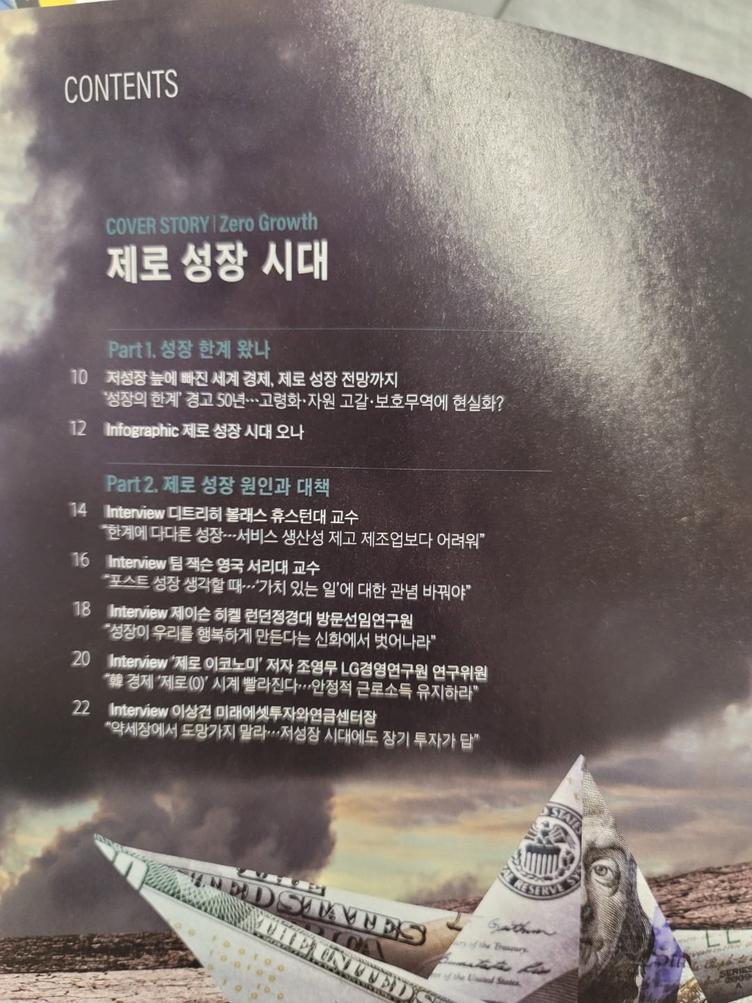 커버스토리인 '제로성장시대'의 목차입니다. 관련 전문가들과의 다양한 인터뷰를 통해 세세하게 이슈를 다룹니다.