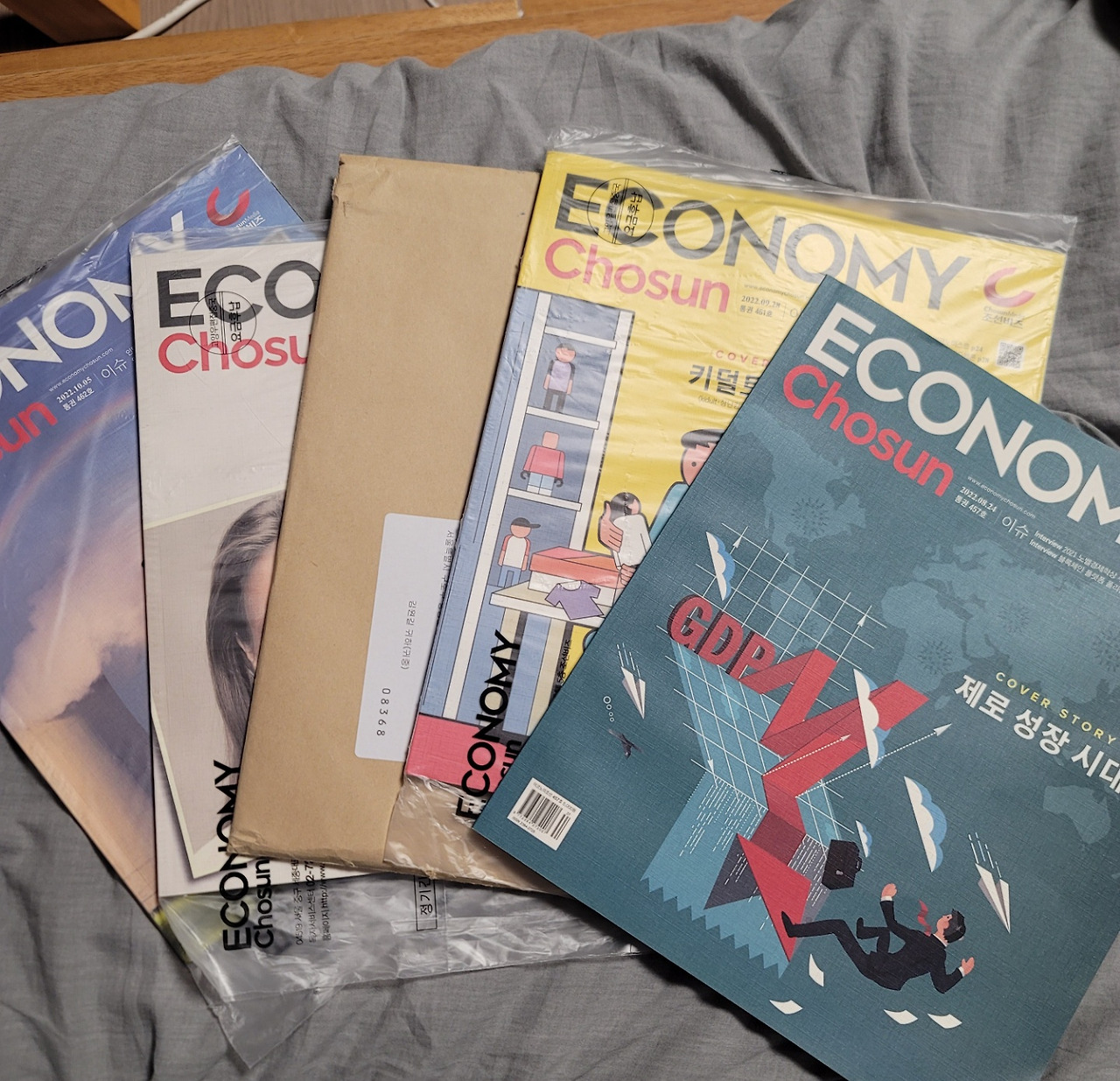 이게 다 뭐냐면요, <이코노미조선>이라는 경제 잡지들입니다. 조선비즈 대학생 기자단이 되어 몇 달 전부터 배송받고 있죠.
