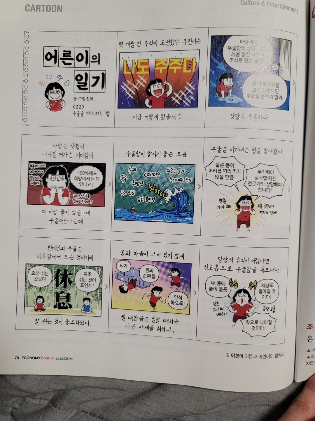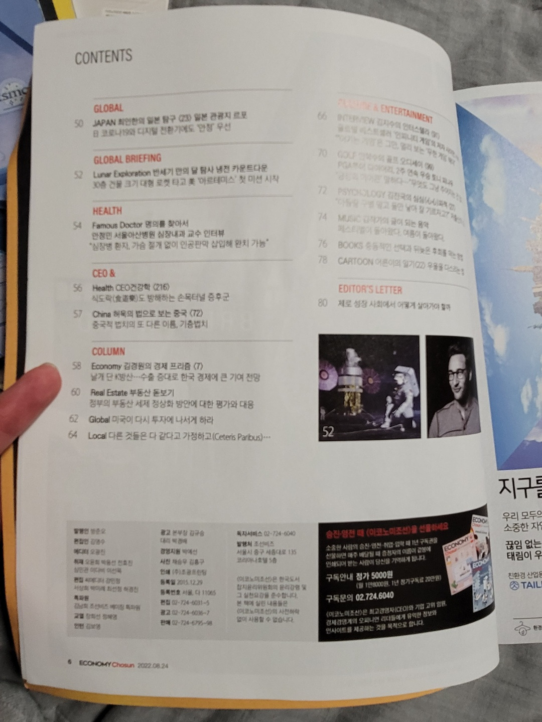 책 소개와 카툰으로 마무리되네요. 확실히 생각해볼 것이 많은, 유익한 잡지라는 생각이 듭니다. 흔히들 조선일보를 두고 '논조에는 동의하지 않지만 글은 세련됐다'라는 이야기를 하는데요. 확실히 저도 유려한 글 전개에 감탄하며 본 것 같습니다. 작문 연습을 하시는 분들도 구독하면 좋을 것 같습니다. 물론 정치 성향이 또렷히 보이는 글 꼭지와 인터뷰들도 배치되어 있었지만, 성향과 반대되는 인터뷰나 연구자료라도 배제하지 않고 인용하는 모습은 인상적이었습니다. 생각할 거리가 많은 주제 선정도 흥미로웠고요.