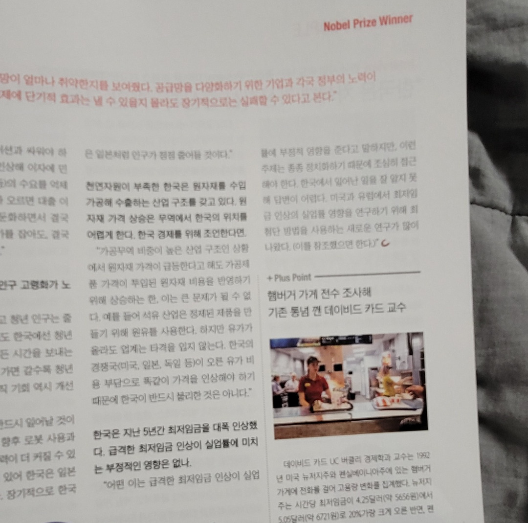 '노벨 프라이즈 위너'라는 섹션인데요. 여기는 좀 재미있는 대목이었습니다. '최저임금 인상이 실업률에 미치는 영향이 없냐'는 질문에 '정치화된 주장, 관련 연구를 확인해보라'는 답변이 있었는데요. 밑 꼭지에 언급된 연구에 따르면 최저임금 인상이 오히려 고용 개선에 긍정적인 영향을 미쳤다고 합니다. 질문 자체는 의도가 보였지만, 본지의 성향과 다른 연구라도 인용하는 모습이 긍정적이네요.