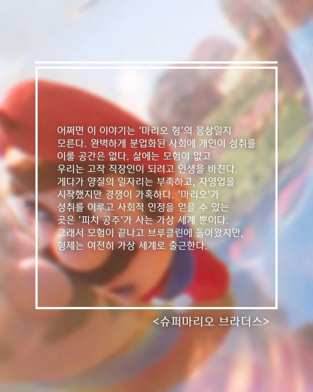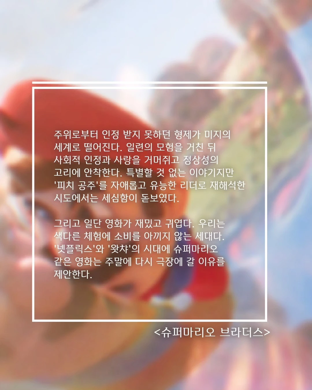언론은 MZ세대가 색다른 체험에 소비를 아끼지 않는다고 한다. 소유는 너무 멀리 있는 목표이기에 경험으로 일상을 채운다.그럴 만도 하다. 초봉은 십수년 째 200만 원인데, 짜장면은 7천 원인 아포칼립스 아니던가. 그러니까 딱히 세련된 이유는 아닌 것이다. 사랑하는 사람을 지키고 세상을 구하는 모험은 이제 꿈 속에서도 불가능하다. 우리는 존재감이 사라진 자아를 찾기 위해 끊임없이 체험을 갈구한다. 세계와 타인을 이해하기 위한 '경험'이 아닌, 생경함 속에서 나를 이해해보려는 발버둥으로서의 '체험'을 중시한다. '넷플릭스'와 '왓챠'의 시대에 극장은 위기를 맞았지만, 체험을 중점에 둔 <슈퍼마리오 브라더스> 같은 영화는 주말에 다시 극장에 갈 씁쓸한 이유를 제안한다.