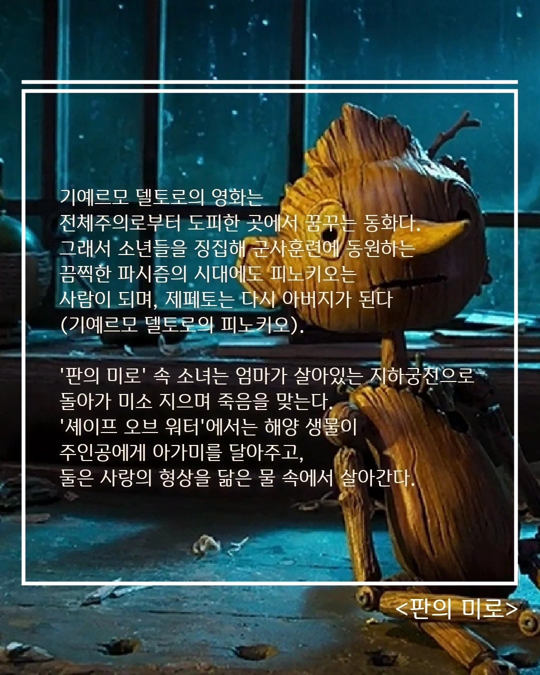 기예르모 델토로의 영화는 전체주의로부터 도피한 곳에서 꿈꾸는 동화다. 그래서 소년들을 징집해 군사훈련에 동원하는 끔찍한 파시즘의 시대에도 피노키오는 사람이 되며, 제페토는 다시 아버지가 된다(기예르모 델토로의 피노키오). <판의 미로> 속 소녀는 엄마가 살아있는 지하궁전으로 돌아가 웃으며 죽음을 맞는다. <셰이프 오브 워터>에서는 해양 생물이 주인공에게 아가미를 달아주고, 둘은 '사랑의 모양'을 닮아 경계 짓지 않는 물 속에서 살아간다.