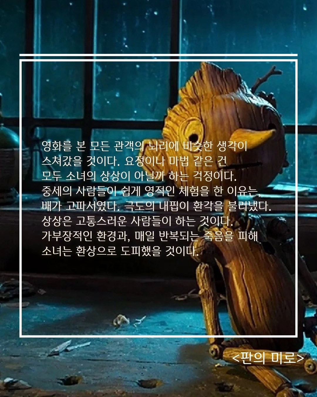 영화를 본 모든 관객의 뇌리에 비슷한 생각이 스쳐갔을 것이다. 요정이나 마법 같은 건 모두 소녀의 상상이 아닐까 하는 걱정이다. 중세의 사람들이 쉽게 영적인 경험을 한 이유는, 배가 고파서였다. 극도의 내핍이 환각을 불러냈다. 상상은 고통스러운 사람들이 하는 것이다. 가부장적인 환경과, 매일 반복되는 죽음을 피해 소녀는 환상으로 도피했을 것이다.