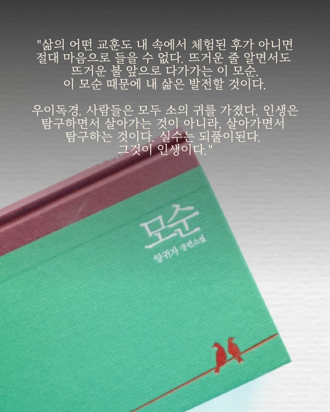 "삶의 어떤 교훈도 내 속에서 체험된 후가 아니면 절대 마음으로 들을 수 없다. 뜨거운 줄 알면서도 뜨거운 불 앞으로 다가가는 이 모순. 이 모순 때문에 내 삶은 발전할 것이다. 나는 그렇게 믿는다. 우이독경. 사람들은 모두 소의 귀를 가졌다."