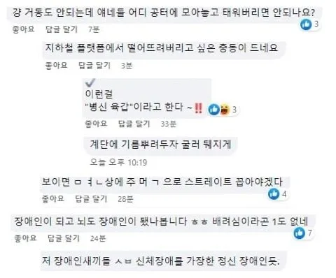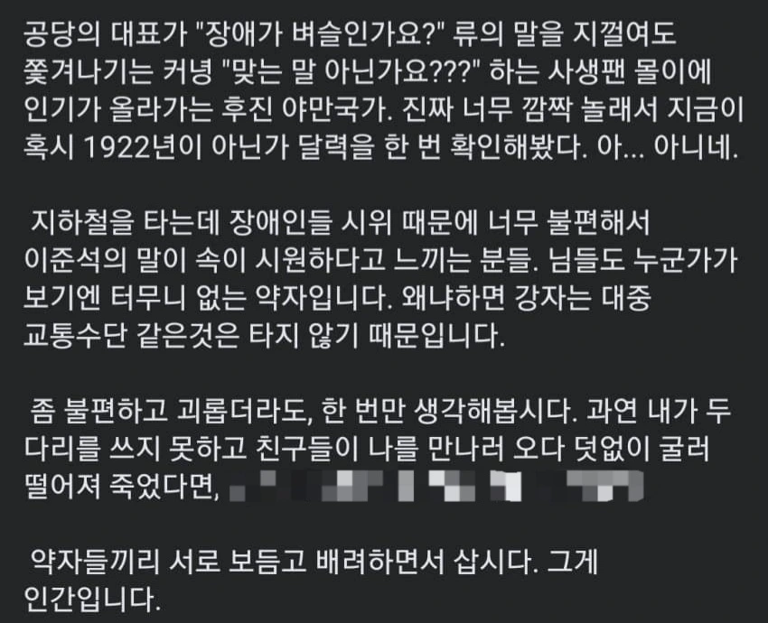 짜증나더라. 미국에선 50년 전에 해결된 장애인 이동권 문제로 이런 일이 벌어진다는 게. 국민의힘 이준석 대표는 페이스북에 달린 댓글들 중 혐오 선동을 지적하는 댓글만 골라서 차단한다. 그러면서 장애 혐오 발언은 방치한다. 저 오물같은 글들을 빤히 보면서 방치한다는 얘기다. 그의 생각이 저들과 다르다고 단언할 수 있을까.