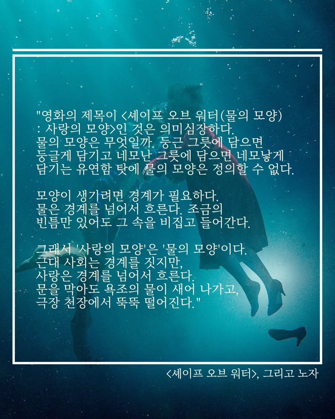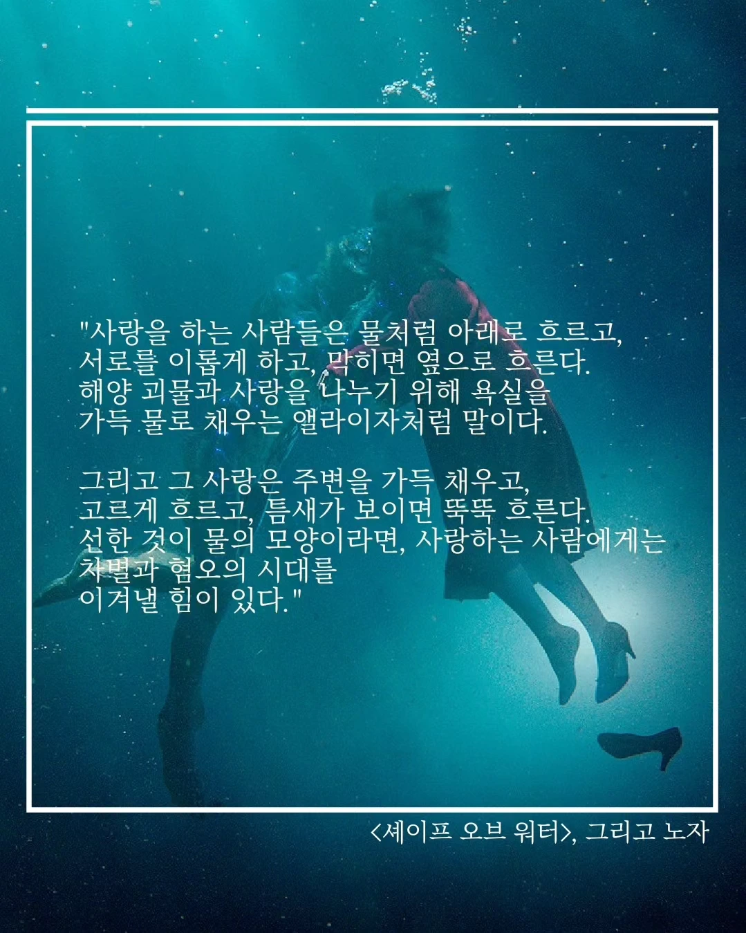 사랑을 하는 사람들은 물처럼 아래로 흐르고, 서로를 이롭게 하고, 막히면 옆으로 흐른다. 해양 괴물과 사랑을 나누기 위해 욕실을 가득 물로 채우는 앨라이자처럼 말이다. 그리고 그 사랑은 주변을 가득 채우고, 고르게 흐르고, 틈새가 보이면 뚝뚝 흐른다. 선한 것이 물의 모양이라면, 사랑하는 사람에게는 차별과 혐오의 시대를 이겨낼 힘이 있다.착취와 억압의 역사를 끊어낼 힘이 있다.