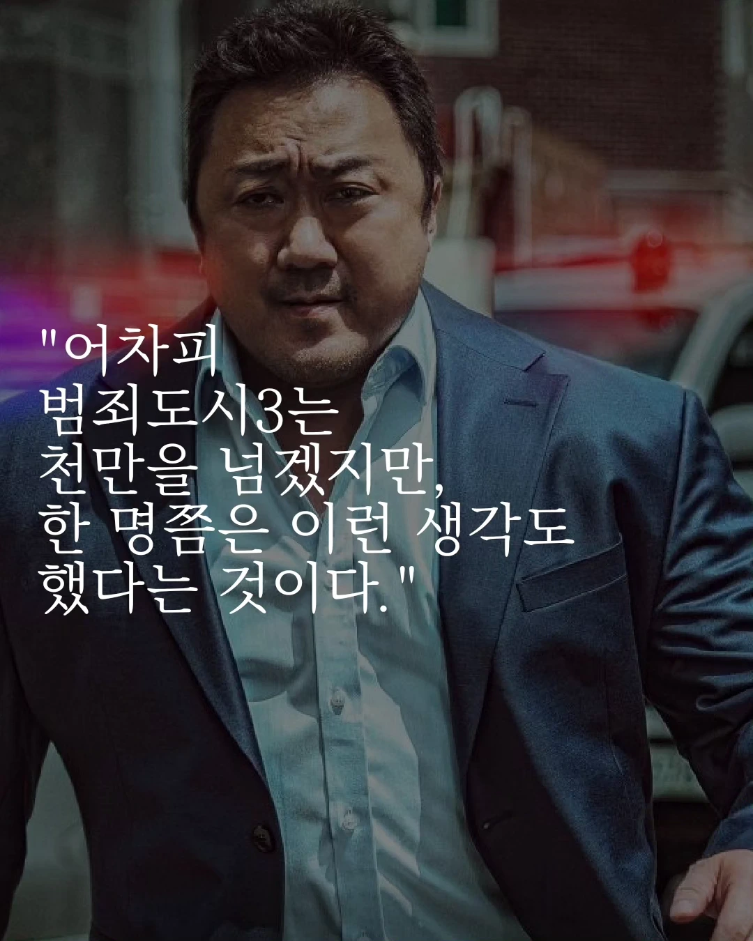 <범죄도시 3>는 웃긴 영화다. 웃다보면 많은 게 용서된다. 극장을 빠져나올 때는 유쾌한 감정이 따라붙는다. 돈 내고 스트레스 받을 필요는 없다. 생각은 영화가 끝난 뒤에 하면 된다.