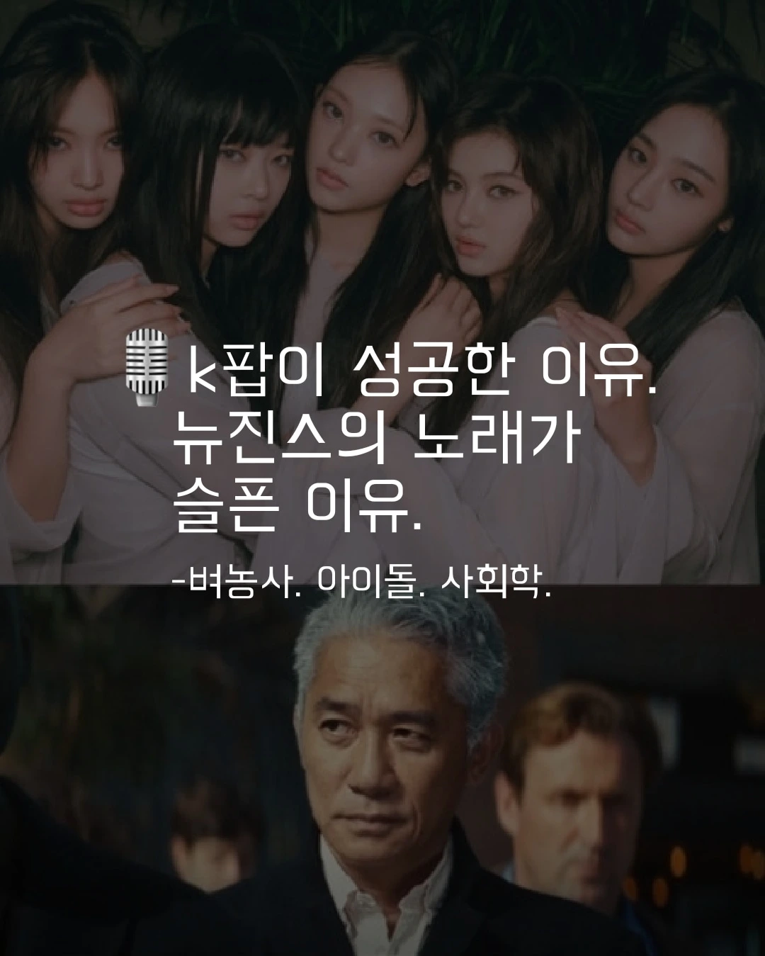 아무튼 이 글은 군입대 후 뉴진스의 뮤비를 반복 시청 당하며 쓰게 된 글이다. 조금 비판적으로 느껴질 수도 있겠지만 내 관물함에도 뉴진스 사진이 붙어있다. <cool with you> 뮤비에 나오는 양조위는 왜 이렇게 멋있게 늙는지 모르겠다. 화양연화 때보다 멋있다. 그런데 양조위가 왜 나오는지는 아직 모르겠다.