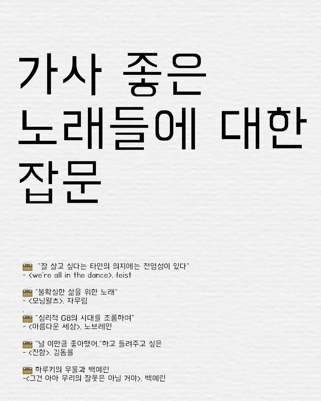 근사한 음식을 먹고, 새로운 곳에 가고, 편하게 쉬고 싶은 욕망은 악한 마음이 아니다. 그 방법을 착각하게 만들어 사람들을 착취하는 사회가 악하다. 협력해야 할 주변 동료들의 것을 빼앗으며 좋은 삶을 스스로 망치는 비굴한 태도가 악하다. 자기는 착실하게 살아가기 때문에 성공할 것이라고 믿는 사람들이 많다. 우리는 잘 살지조차 못하고 있다. 잘 사는 것은 잔잔하고 아름답고 조화로운 이런 노래를 닮았고, 그래서 아름다운 노래를 들을 때면 정신이 고양된다.