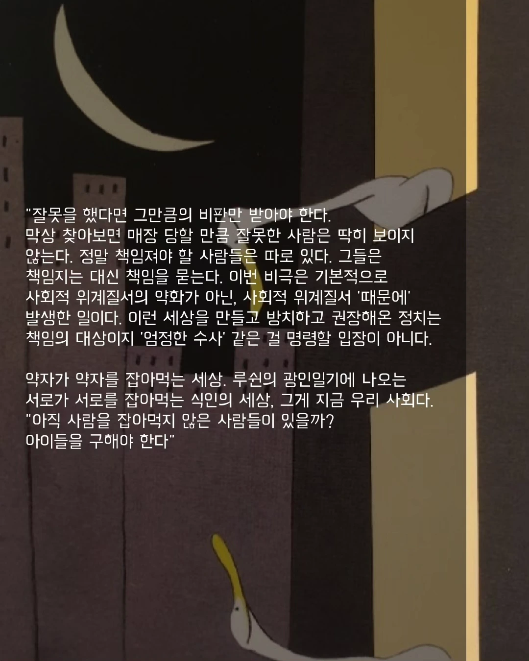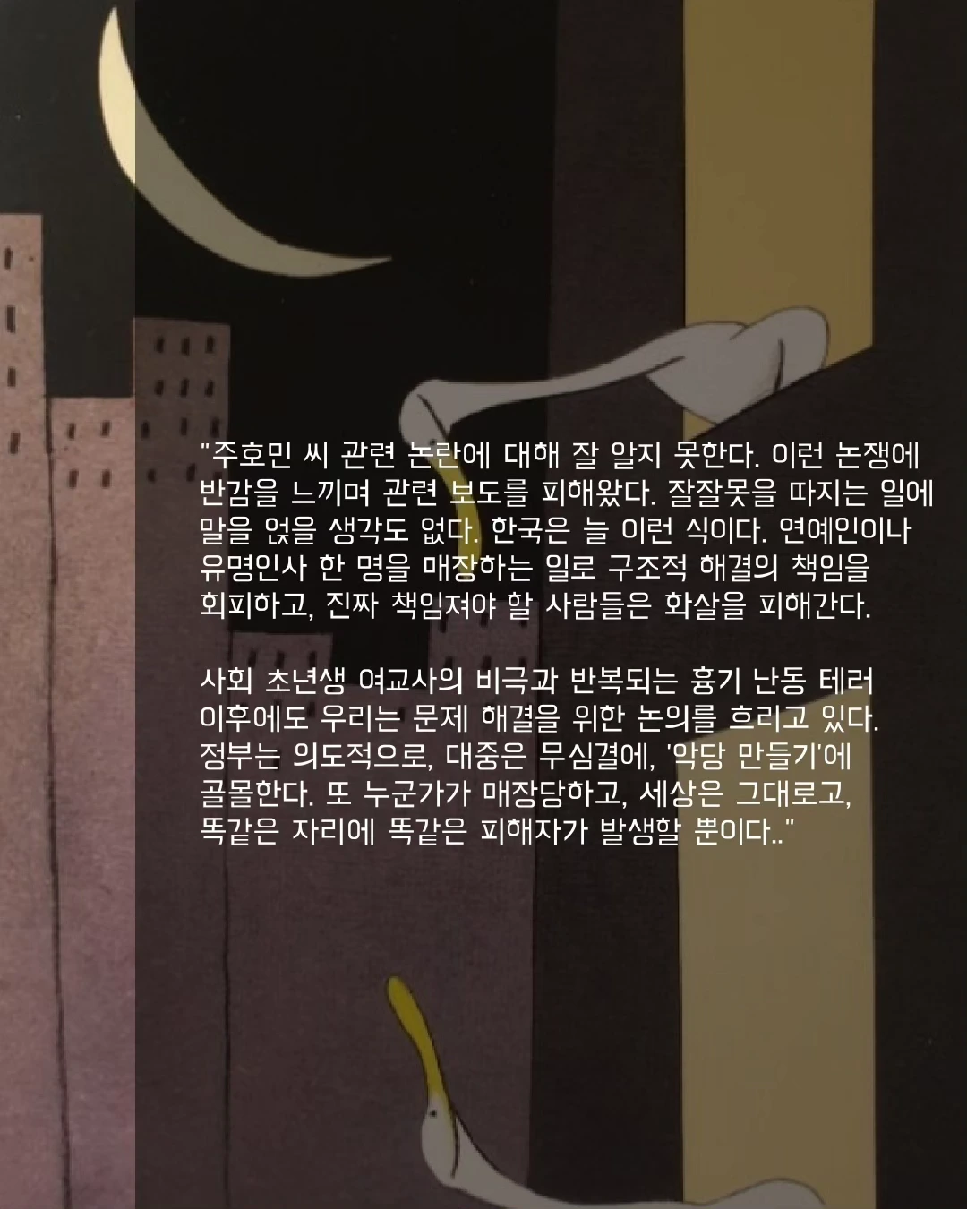 사회적 비극이 발생했을 때, 악당을 만들어 비난하는 일은 두뇌를 편하게 한다. 복잡한 사회문제를 직시하고, 개혁을 위한 지난한 논의를 반복하고, 일상의 메커니즘을 개조하는 피로한 일 대신, '이해할 수 없는 악'이라는 직관적이고 본능적이며 익숙한 서사를 세운다.
