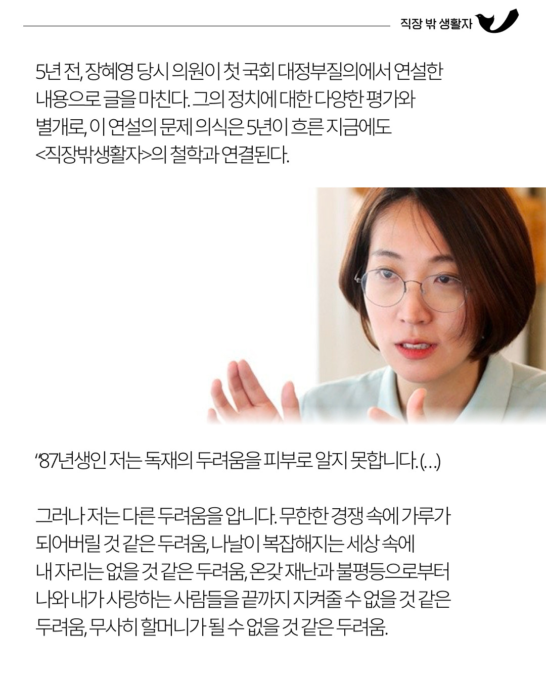 5년 전, 장혜영 당시 의원이 첫 국회 대정부질의에서 연설한 내용으로 글을 마친다. 장혜영 의원의 정치 활동에 대한 다양한 평가와 별개로, 이 연설의 문제 의식은 5년이 흐른 지금에도 <직장밖생활자>의 문제의식과 연결된다.