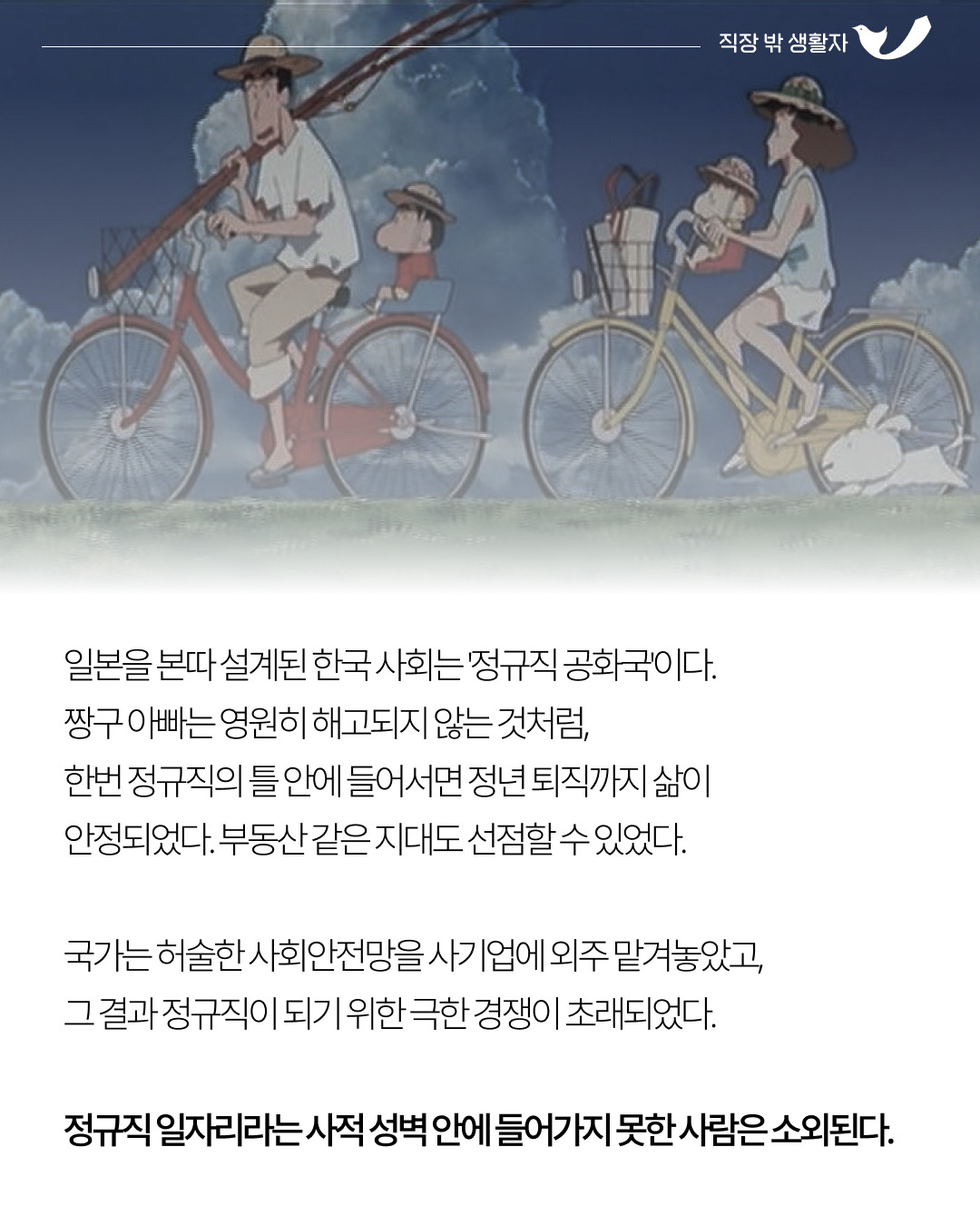 일본을 본따 설계된 한국 사회는 '정규직 공화국'이다. 짱구 아빠는 영원히 해고되지 않는 것처럼, 한번 정규직의 틀 안에 들어서면 정년 퇴직까지 인생이 안정되었다. 부동산 같은 지대도 선점할 수 있었다. 국가는 허술한 사회안전망을 사기업에 외주 맡겨놓았고, 그 결과 정규직이 되기 위한 극한 경쟁이 초래되었다. 정규직 일자리라는 사적 성벽 안에 들어가지 못한 사람은 소외된다.