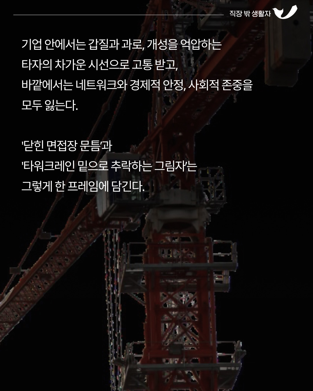기업 안에서는 갑질과 과로, 개성을 억압하는 타자의 차가운 시선으로 고통 받고, 그 바깥에서는 네트워크와 경제적 안정, 사회적 존중을 모두 잃는다. '닫힌 면접장 문틈'과 '타워크레인 밑으로 추락하는 그림자'는 그렇게 한 프레임에 담긴다.