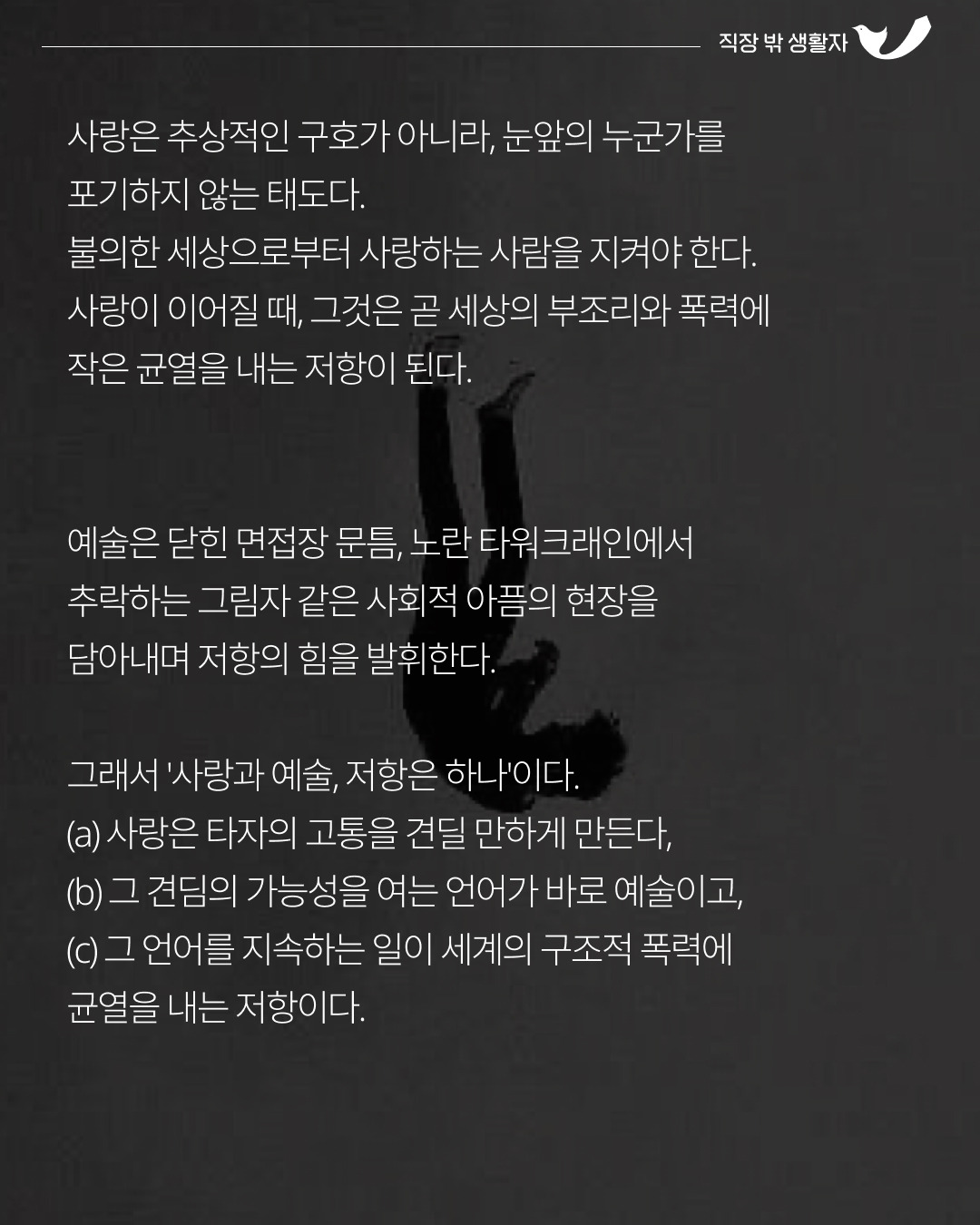 예술은 닫힌 면접장 문틈, 노란 타워크래인에서 추락하는 그림자 같은 사회적 아픔의 현장을 담아내며 정치적 힘을 발휘한다. 그래서 '사랑과 예술, 저항은 하나'이다.