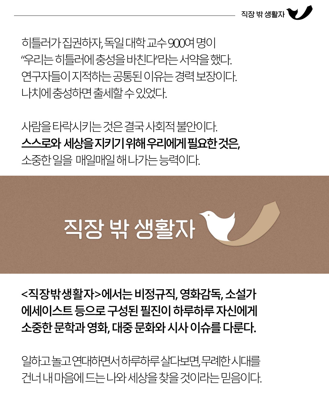 결국 우리를 타락시키는 것은 불안이다. 스스로와 세상을 지키기 위해 우리에게 필요한 것은, 소중한 일을 매일 해나가는 능력이다. '직장밖생활자'에서는 비정규직 소설가, 영화감독, 에세이스트 등으로 구성된 필진이 하루하루 자신에게 소중한 문학과 영화, 드라마와 시사 이슈를 다룬다. 일하고 놀고 연대하면서 하루하루 살다보면, 무례한 시대를 건너 내 마음에 드는 나와 세상을 찾을 것이라는 믿음이다.