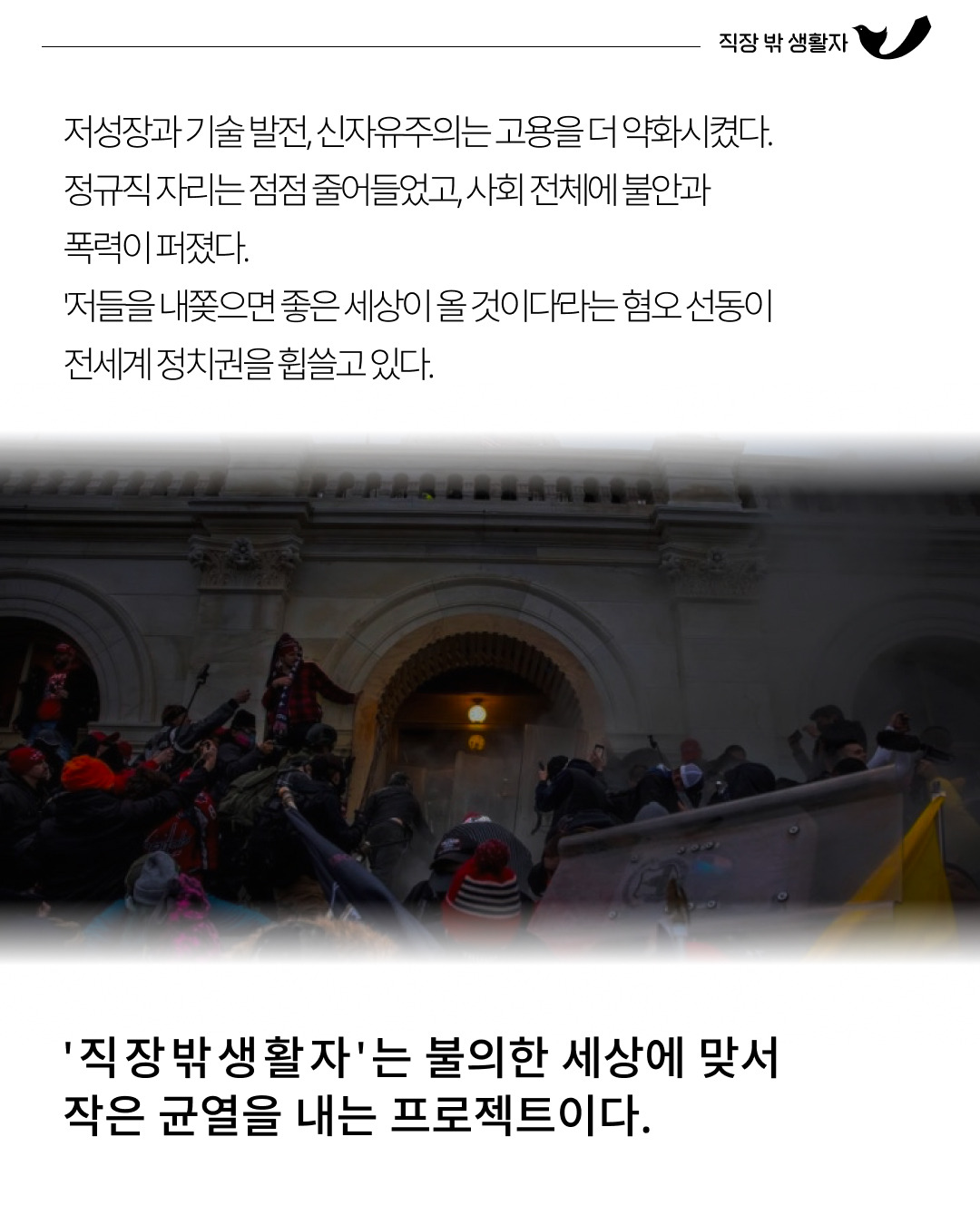 '직장밖생활자'는 불의한 세상에 맞서 작은 균열을 내는 프로젝트이다.