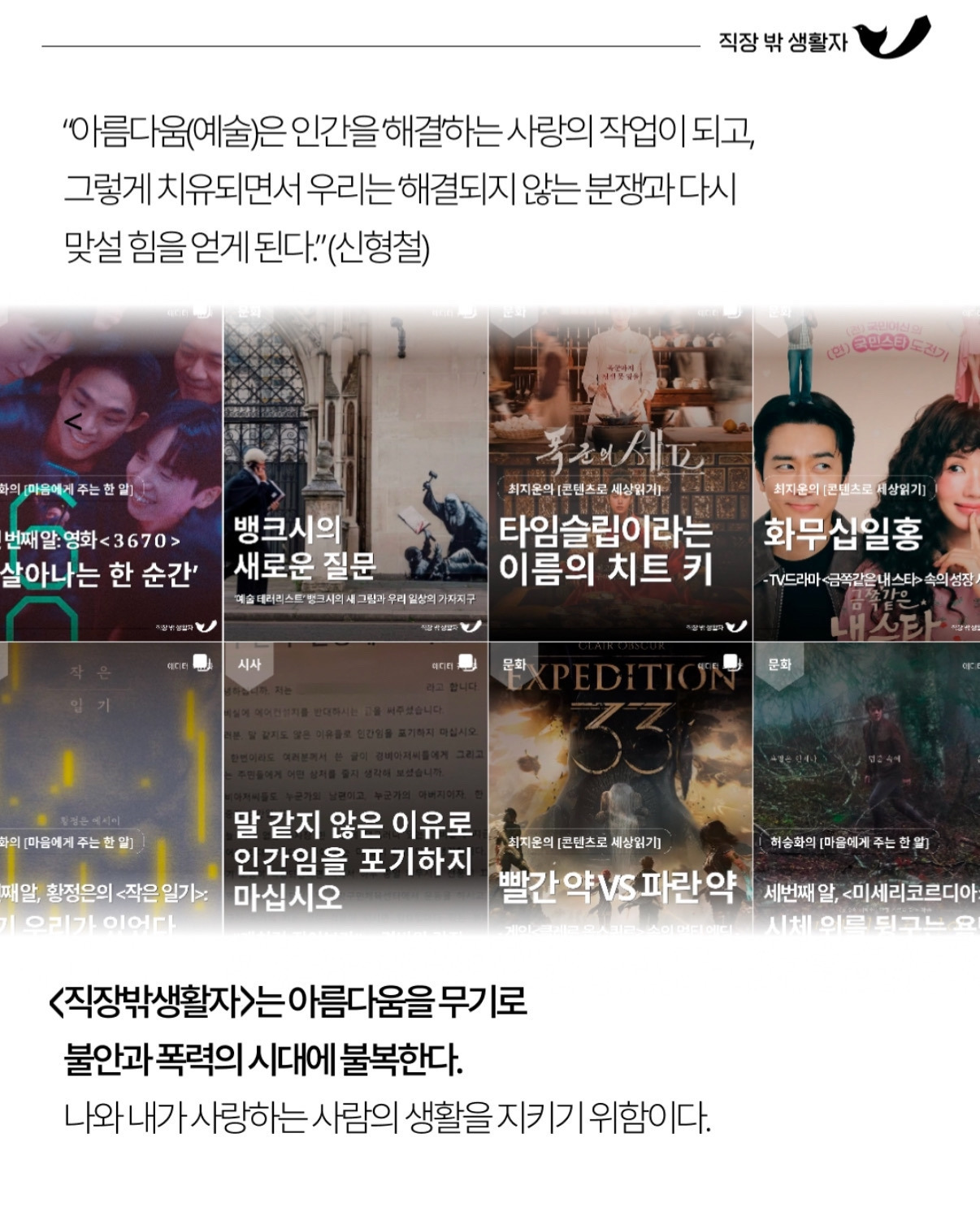 <직장밖생활자>는 아름다움으로 불안과 폭력의 시대에 불복한다. 나와 내가 사랑하는 사람의 생활을 지키기 위함이다.
