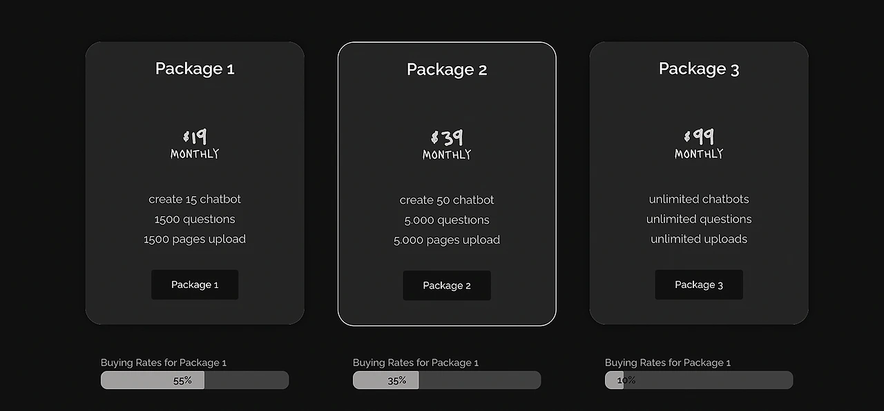 이런 디자인에서 사람은 일반적으로 2번 패키지를 고릅니다. 지나가면서 봐도 2번 패키지가 가장 현명한 소비처럼 보이니까요. 아주 소수의 사람들이 1번, 3번 패키지를 선택합니다.