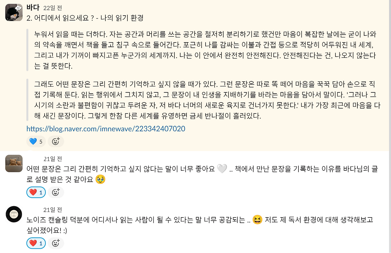 제가 정말 복이 많은 사람이라 .. 파랑에서 활동해 주시는 분들도 저와 결이 비슷하고 좋은 분들이 참 많습니다 ! 아낌없이 정보를 나누고, 책을 추천해주고, 서로의 고민을 경청해 줘요. 이런 여성들과 느슨하게 연결되어 한 걸음 내딛는 경험을 해보셨으면 해요.