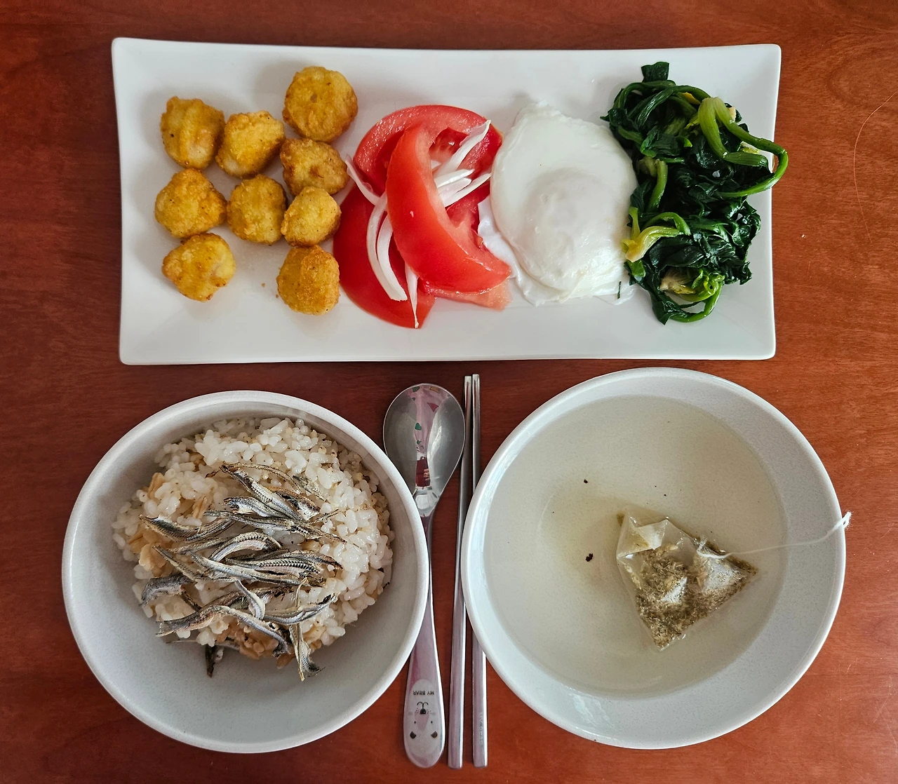 계란, 멸치, 견과류와 토마토에 채 썬 양파와 함께
