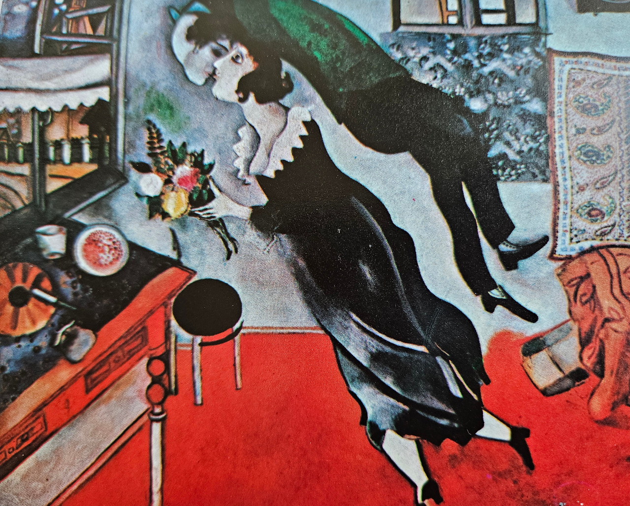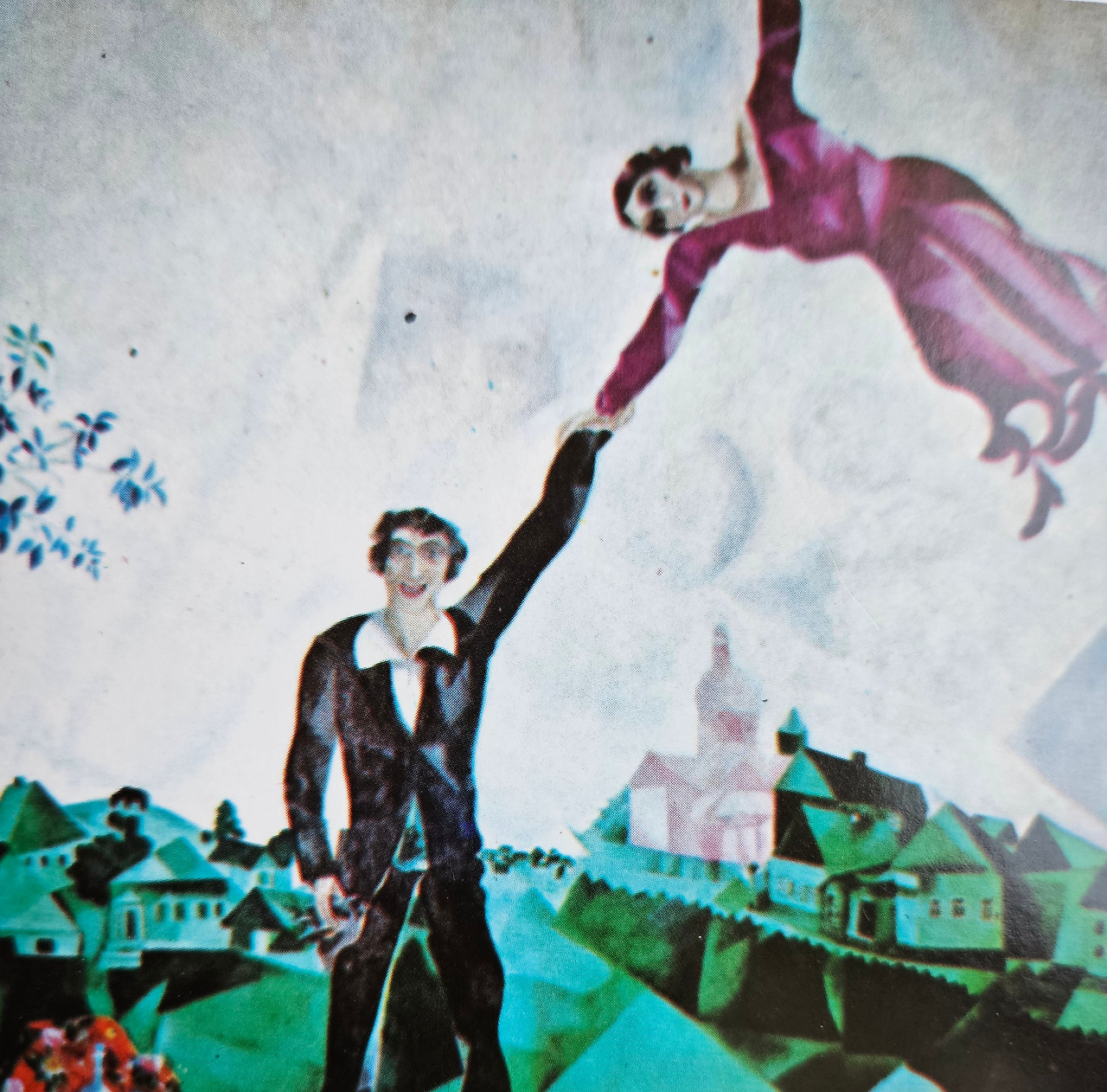 그림 속 샤갈은 공중을 날 듯 몸을 비틀어 벨라에게 키스하고 있고, 그녀는 평온하게 꽃다발을 안고 있다