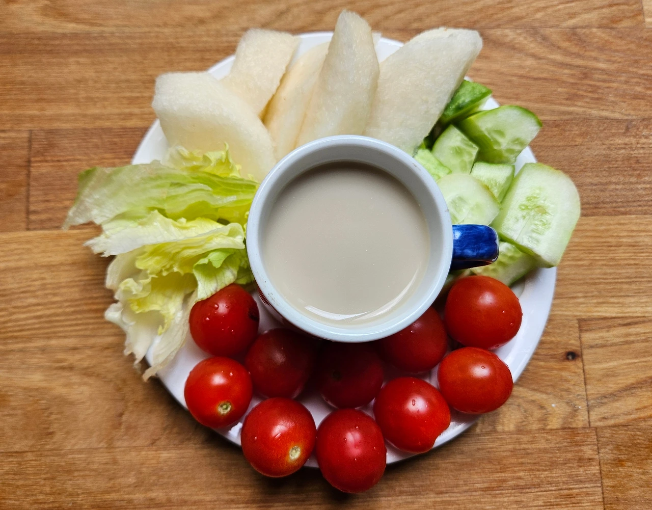 야채를 골고루 썰어 놓은 접시에 칼슘두유를 마셔보니