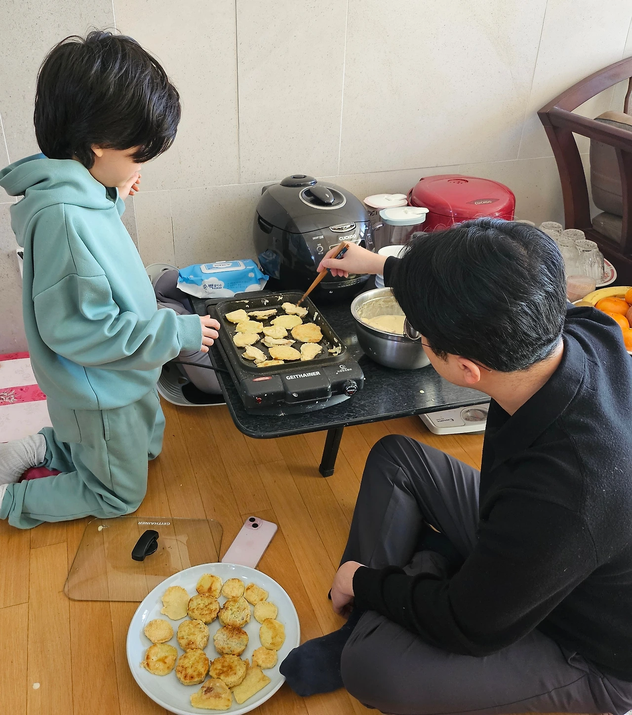 손자가 아빠와 함께 "추석"이라고 감자전을 부치고 있다