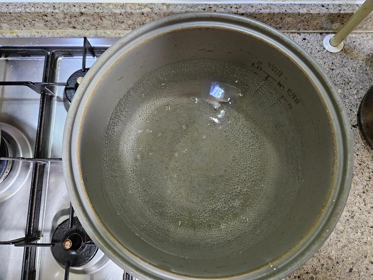 가스쿡 위에 밥통(물 1/2)을 올려서 가스불 켜서 물의 온도를 70°C~80°C 가되도록 가스불조절하며 맞춘 다
