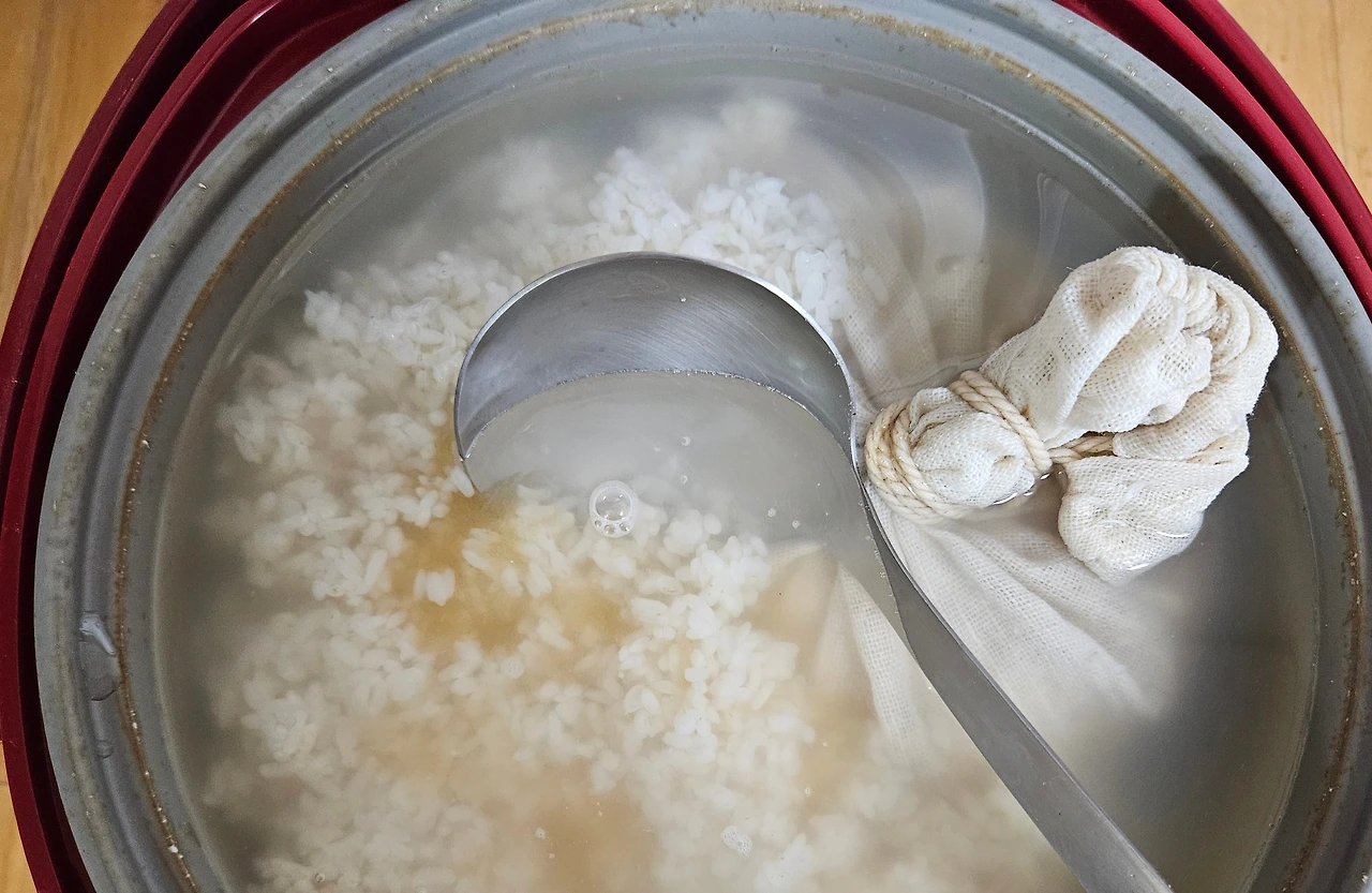 밥알 몇 개가 엿기름 배주머니 주변으로 동동 뜨면 성공이다