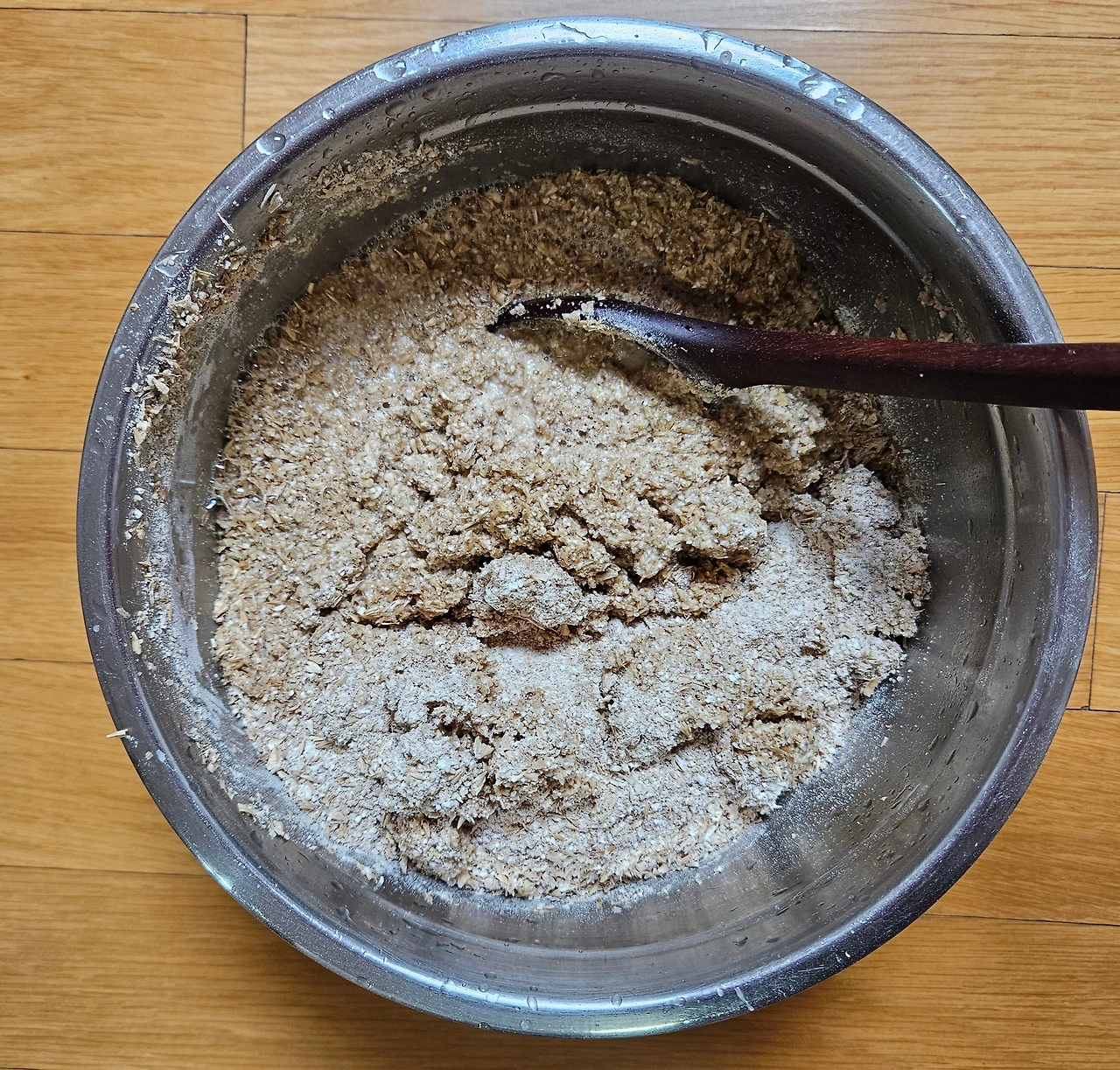 8. 볼에 엿기름 500g에 생수,혹은,정수기물을 붓고 비빔밥처럼 비빈 후 배주머니를 열어서 물에 비빈 엿기름을 넣어서 꽁꽁 묶어서 깨끗한 접시나 볼에 둔다