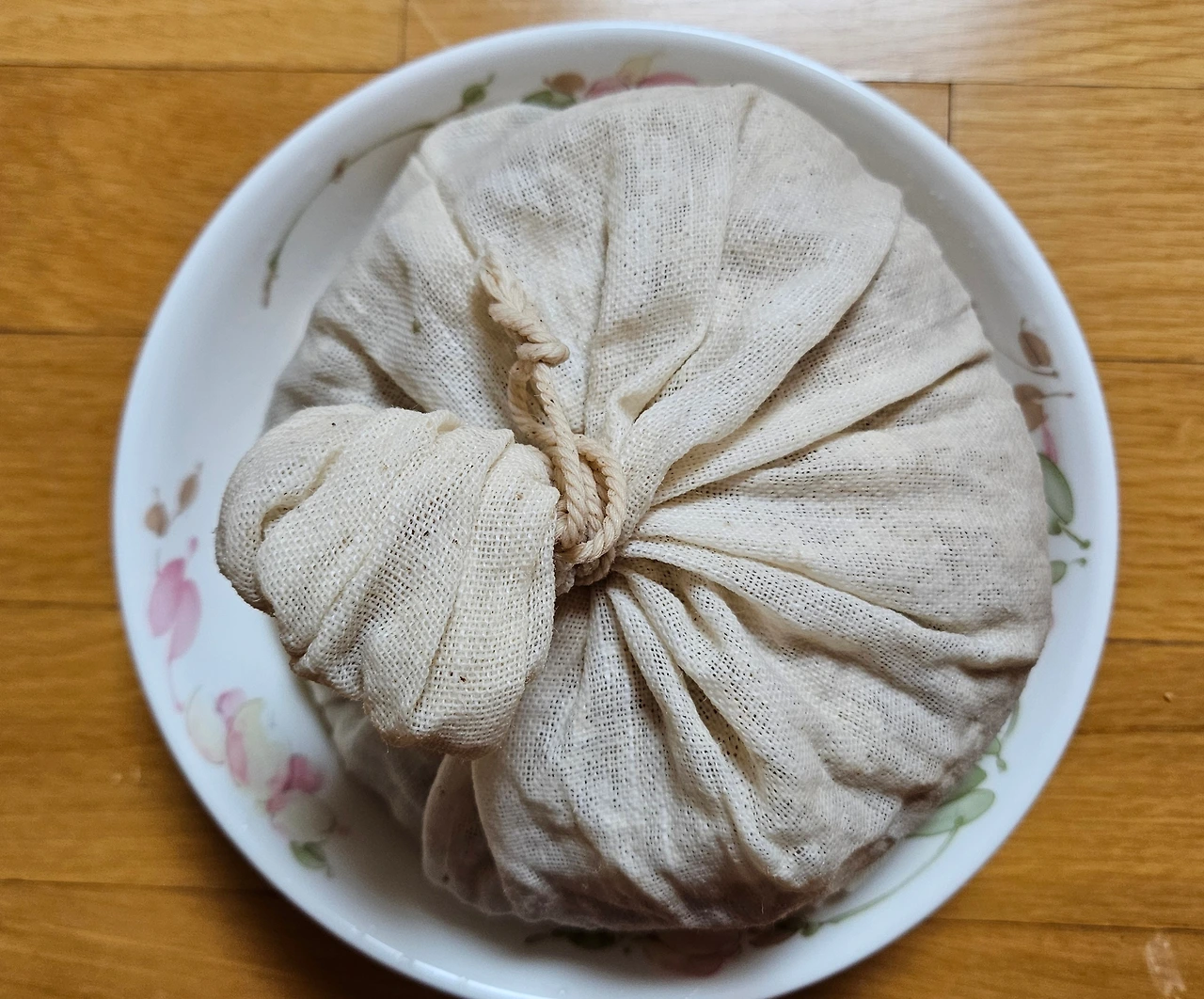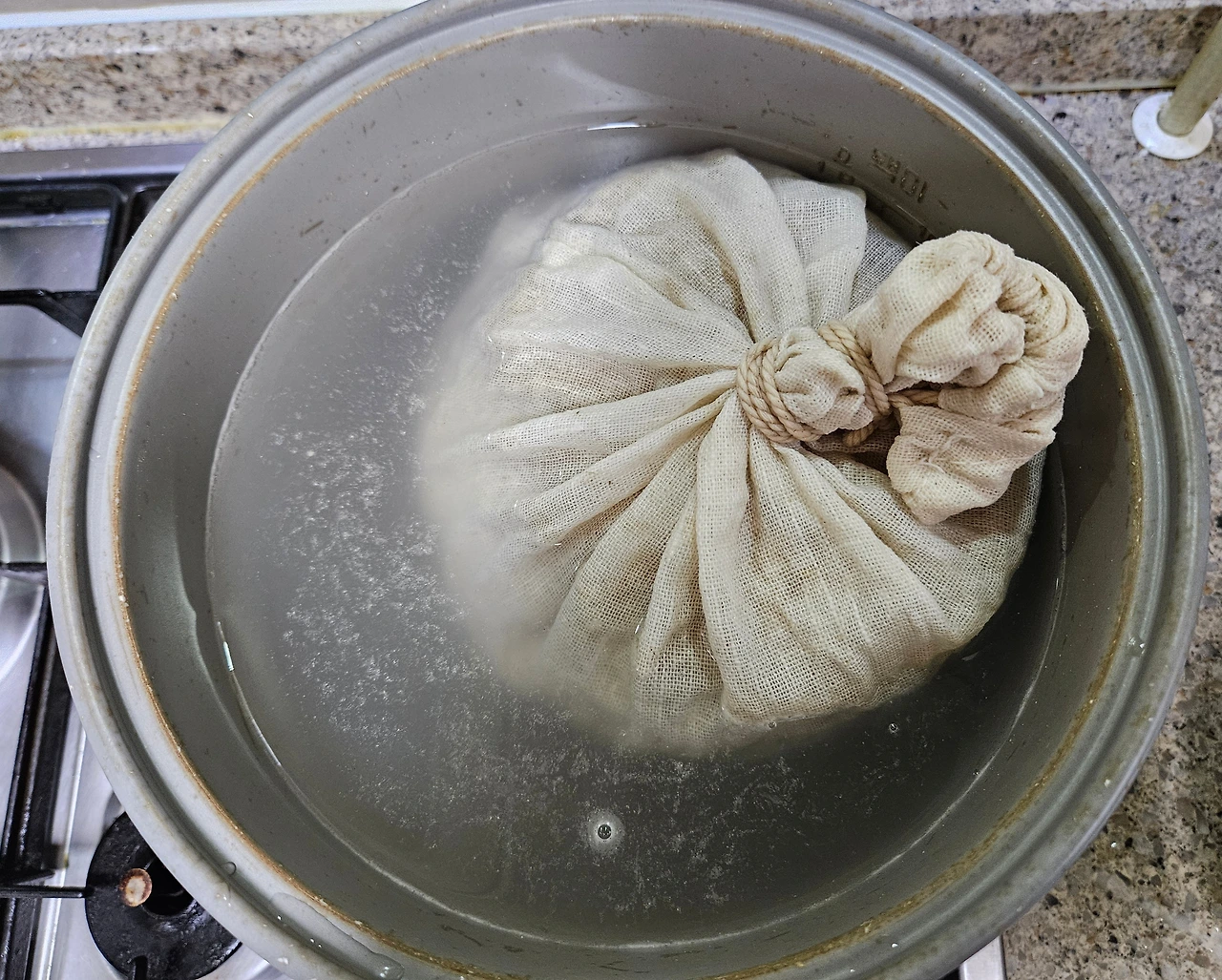 이때 엿기름이 빠져나오지 않게 목실로 두세 바퀴 돌려서 한번 매듭으로 꽁 묶는다