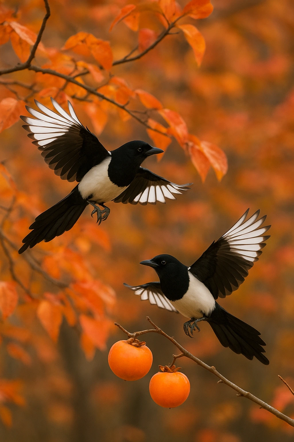 가을 영양 가득한 홍시를 먼저 따 먹은 까치 한 마리가
