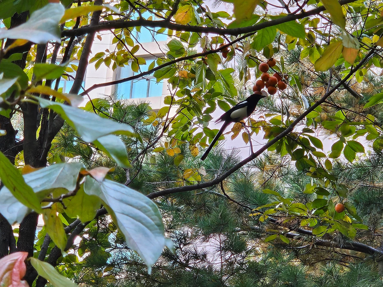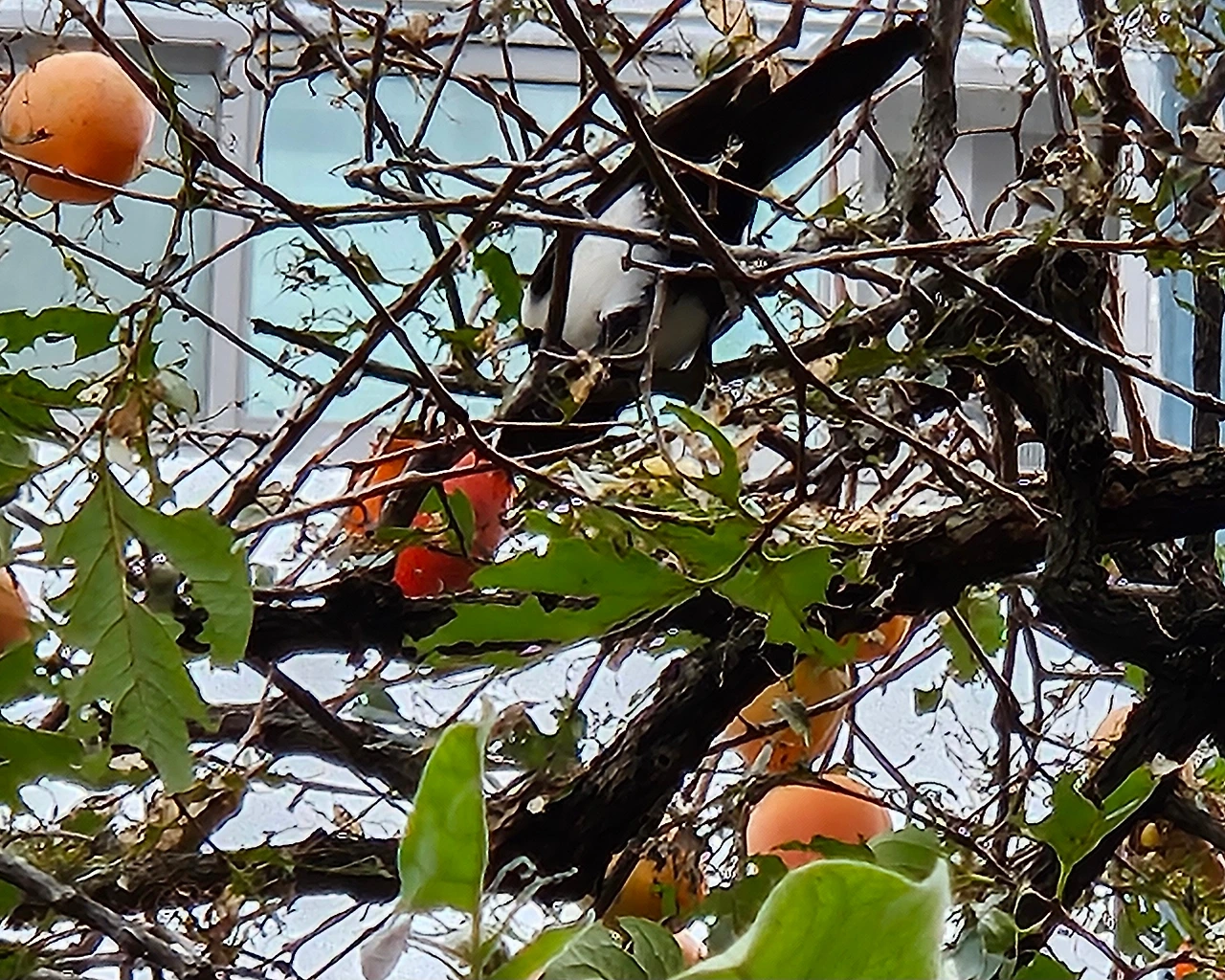 까치는 뭔가를 열심히 조사하듯 감알맹이 들을 부리로 쪼아 가며 이 가지 저 가지로 옮겨가며 날아다녔다
