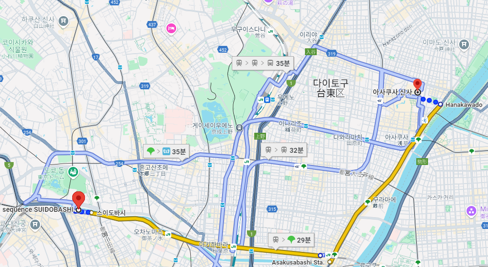 어떻게든 먹은 우리는 오전 8시 반쯤 호텔을 나와서 스이도바시역에서 아사쿠사로 갈 준비를 하였다. 내가 구글 맵을 켜고 찾은 노선은 아래와 같다.