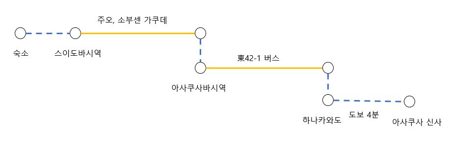 참조 : 구글 지도스이도바시역에서 아사쿠사바시란 역까지 지하철로 가고. 아사쿠사바시역에서 동 42-1 버스를 타고 아사쿠사까지 가는 코스였는데. 아사쿠사바시역에서 버스 타는 게 걸리긴 했었다. 일본 지하철도 처음인데, 버스는 더더욱 처음이었고. 버스는 어나더레벨이라.. 그러나, 뭐 구글 지도 보고 하면 되겠지란 생각이었어서 크게 걱정하지 않았던 나였다.