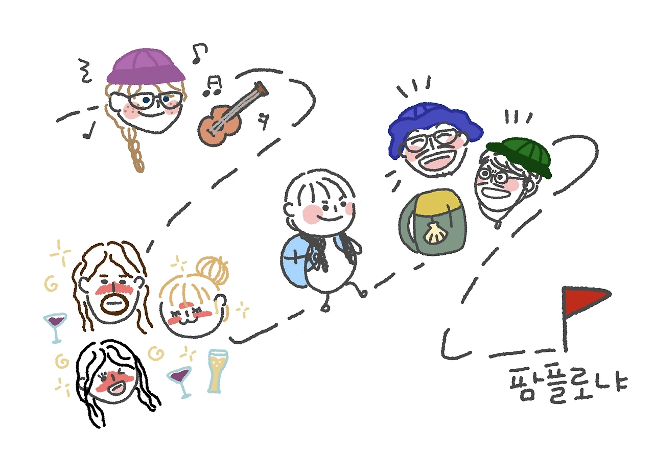 얼마 지나지 않아 앞쪽에 누군가 걷는 모습이 보였다. 배낭 옆에 우쿠렐레를 단 채로 걷고 있던 그녀는 캐나다에서 왔다는 ‘쉘’이었다. 흐느끼던 소리는 귀신이 아닌 쉘이 흥얼거리던 목소리였다. 음악을 전공했다는 쉘의 말에 실용음악을 전공한 나는 반가움이 느껴져 이것저것 자연스레 대화를 나눴다. 쉘은 이 길에서의 경험을 모아 노래로 만들어 앨범을 내고 싶다고 했다. 그 말을 듣는 순간, 나도 이 여정이 나에게도 어떤 것을 만들어내는 창작이 되지 않을까? 하는 생각이 들었다. 그리고 지금 이렇게 글을 쓰고 있는 나를 보며 피식 웃게 됐다.