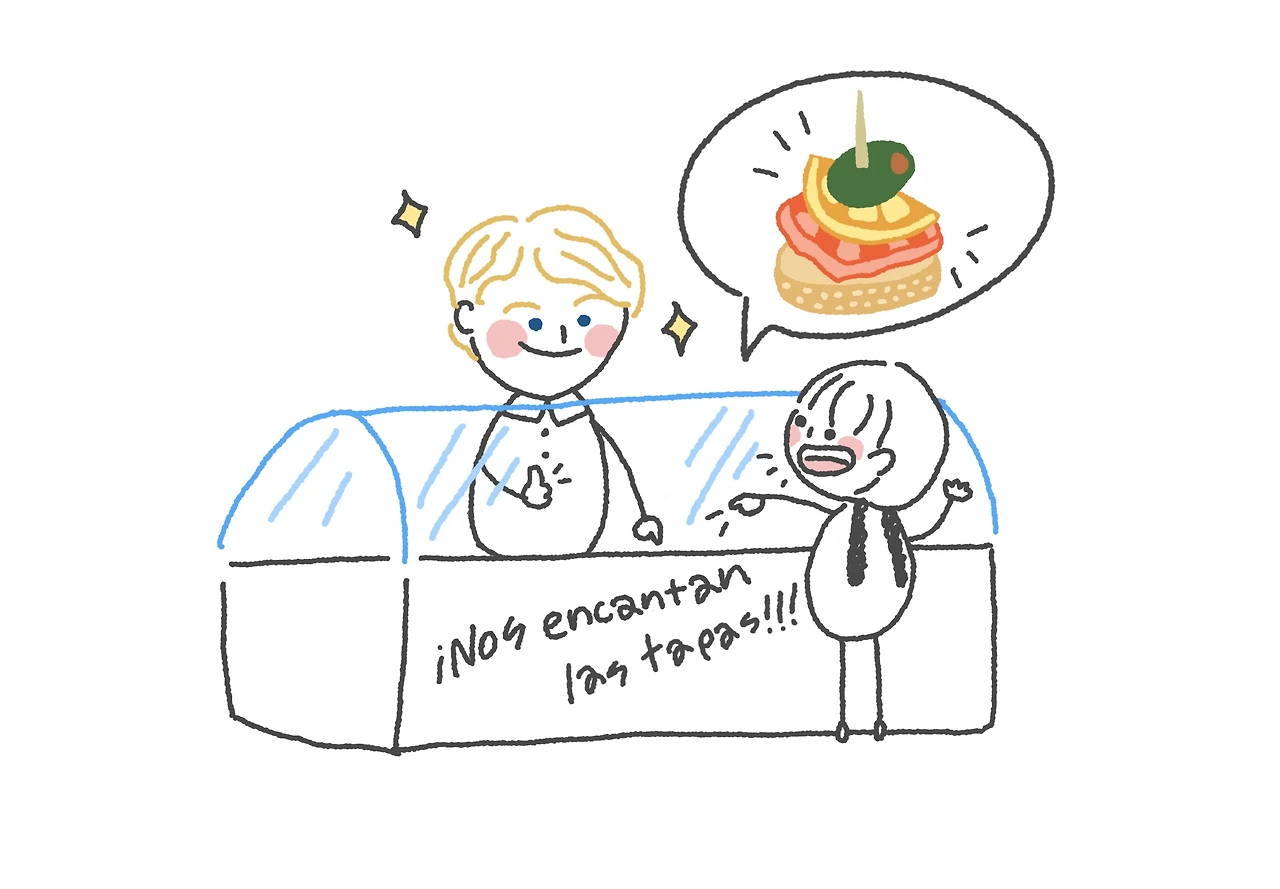 유명하다는 핀초스도 먹어봤다. 바스크식 타파스로, 맥주 안주로 딱 좋은 핑거푸드다. 그런데 타파스는 생각보다 먹기 위한 난이도가 높았다. 테이블에서 메뉴판을 보고 주문하는 방식이 아니라 북적거리는 바 안쪽으로 들어가 손짓으로 하나하나 직접 골라야 했다. 스페인어도 모르고, 어디서부터 어떻게 주문해야 할지 몰라 눈만 계속 빙빙 돌렸다. 결국 첫 번째 식당은 포기. 더 조용한 식당으로 발걸음을 옮겼다. 다행히 두 번째 식당에는 사람도 많이 없고 직원도 잘생겼었다. 내가 손짓으로 이것저것 주문하며 테이블을 왔다 갔다 하자, 그는 웃으며 인기 많은 메뉴를 추천해주기도 했다. 그렇게 용기를 내다보니, 어느새 작은 테이블 위, 색색의 핀초스 접시들이 하나둘 쌓여갔다. 처음엔 이런 어색한 상황에 긴장했지만, 한 입 한 입 먹을수록 핀초스와 맥주는 찰떡콩떡이었다. 포기하지 않고 용기 내서 주문한 나를 칭찬하며 건배!