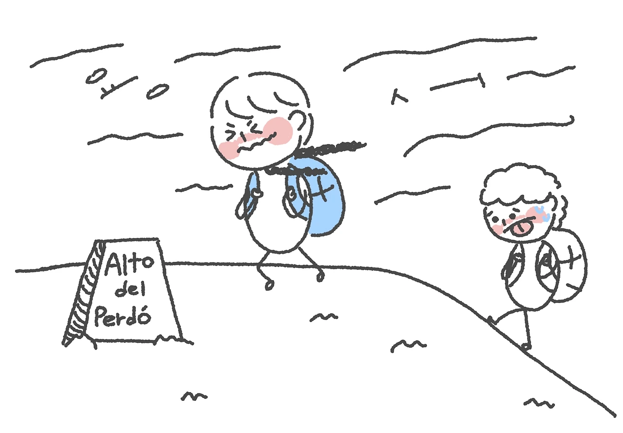 긴 언덕길을 오르다 보니 오늘의 하이라이트 ‘용서의 언덕’이라는 곳에 도착하게 되었다. 사실 나는 ’ 용서‘의 언덕을 ’ 용사‘의 언덕으로 착각해서, 머릿속엔 갑옷을 입은 기사가 드래곤이나 뭐 그런 거 잡으러 가기 전에 마음을 다잡는 신성한 장소일까?라는 생각을 하며 비장하게 걸었다. 도착하고 나서야 이 언덕이 ’ 용서‘의 언덕이라는 걸 알고 빠르게 내가 용서받을게 뭐가 있다 머리를 굴렸다. 미리 내가 순례길에 대한 공부를 했다면, 오늘 이 언덕을 넘으며 나의 실수들과 잘못들을 스스로 조금이나마 용서하는 자리였을 텐데. 순례길에 대해 제대로 알아보지 않은 이 상황을 용서를 구해야 했다. 하지만 용서고 뭐고 바람이 너무 세게 불어서 감상에 젖을 틈도 없이 거의 날아갈 뻔했다.