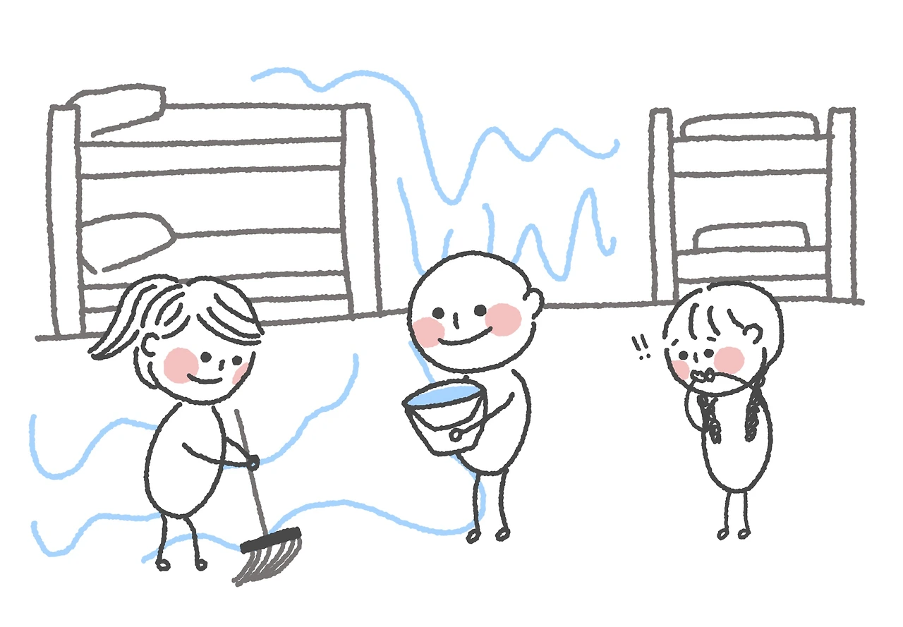 어처구니없는 웃음을 짓고 있는데, 이번에는 알베르게 안쪽에서 또 웅성웅성하더니, 비가 새기 시작했다. 내가 배정받은 침대가 있던 왼쪽 벽은 괜찮았지만, 오른쪽 벽은 심각했다. 바닥엔 물이 잔잔하게 고였고, 벽에 붙은 침대들과 배낭이 줄줄이 젖었다. 당황했지만, 순례자들은 모두가 말없이 움직이기 시작했다. 수건과 대걸레를 들고 물을 닦고, 침대를 벽에서 떼어내 정리했다. 아무도 소리를 지르지 않았지만 그 조용한 협동은 마치 소리 없는 아비규환 같았다.