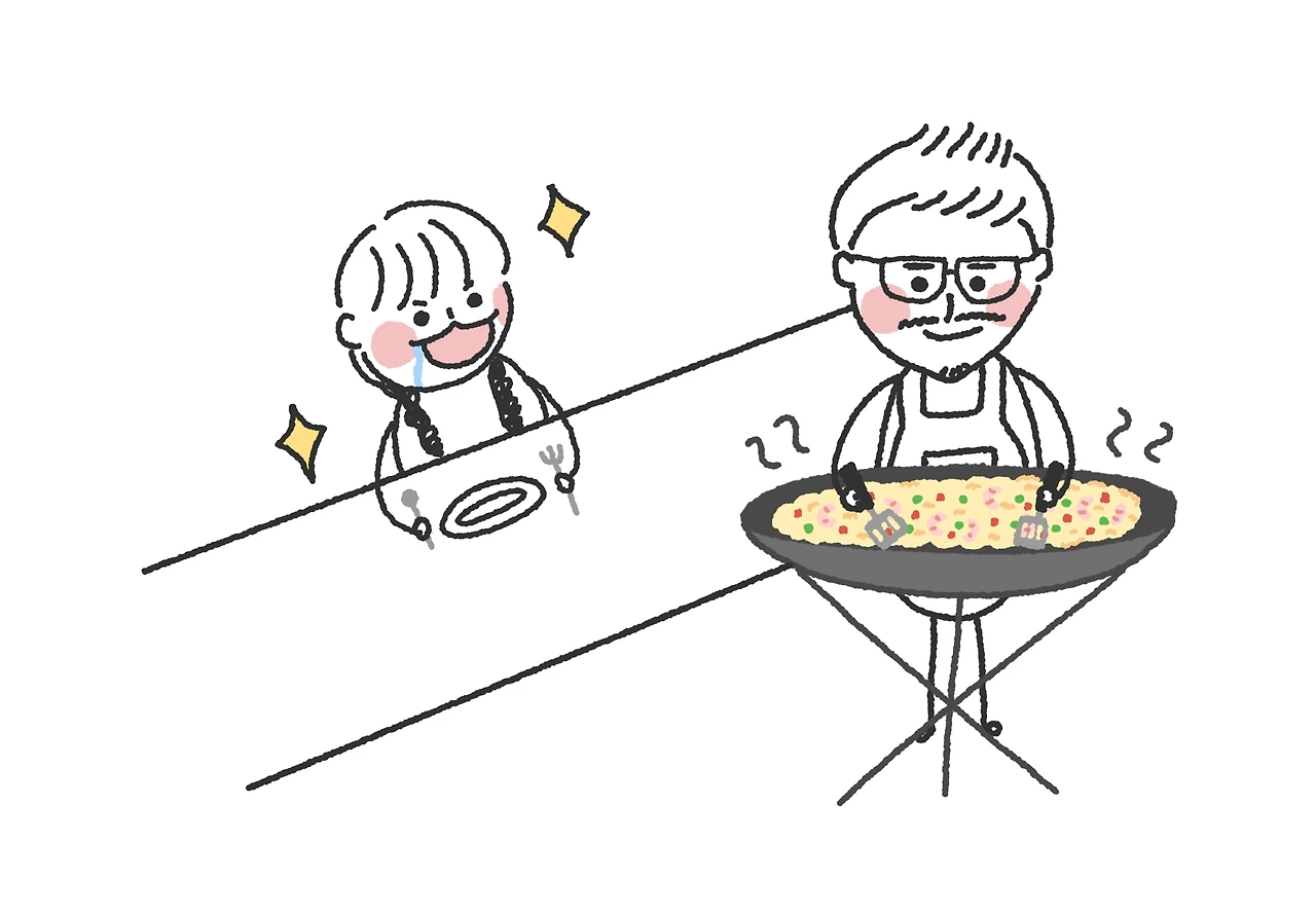 해가 질 무렵, 드디어 저녁시간. 모두가 알베르게 주방 문 앞에서 설레며 기다리고 있었다. 길게 차려진 테이블 위엔 이미 식기가 가지런히 놓였고, 한쪽에선 커다란 냄비에 빠예야가 볶아지고 있었다. 문이 열리자마자 사람들은 설레는 표정으로 자리를 잡고 앉았다. 빠예야 냄비의 뚜껑이 열리자 여기저기서 탄성이 터졌다. 모두가 빠예야에게 사랑 고백이라도 받은 듯 행복한 얼굴이었다. 빠에야가 담긴 접시는 옆자리로, 또 옆자리로 전달되며 계속 나누어졌다. 와인을 따르고 모두가 함께 외쳤다. “부엔 까미노!” 이곳에서 국적도, 나이도, 성별도 상관없다. 순례자라는 이유 하나로 모두가 친구가 된다