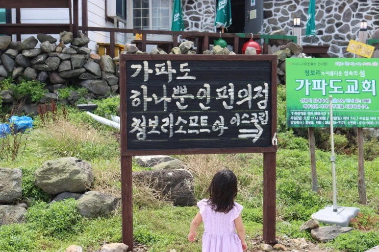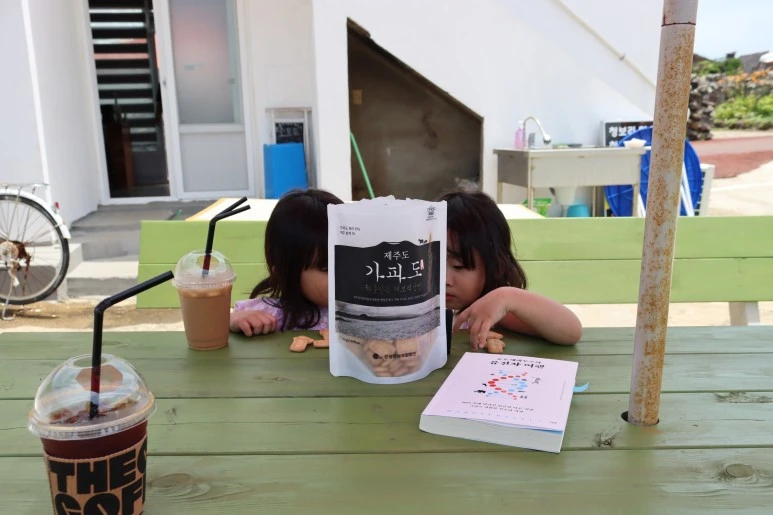 뭐 아무튼 쓸데없는 이야기이지만 세계가 모두 연결되는 근대의 역사는 흥미롭다. 가파도는 여름에는 수영을 할 수 있는 듯하다. 수영시설과 샤워시설 등이 있었는데 우리가 갔을 때는 운영 전인 듯하다. 가파도는 이곳저곳에 벽화가 그려져 있다. 하늘이 넓은 게 뉴질랜드를 다시 돌아온 느낌이었지만, 아기자기한 돌담이 제주스럽다. 우리가 아이들의 손에 묻은 아이스크림을 닦기 위해 방문한 카페인데, 엄청 젊은 청년 사장님 둘이서 가게를 운영하는 듯했다. 급하게 들어가느라 아메리카노를 시키고, 아이들이 배고프다고 하여 미숫가루를 시켜주었다. 그리고 마지막 건빵까지!