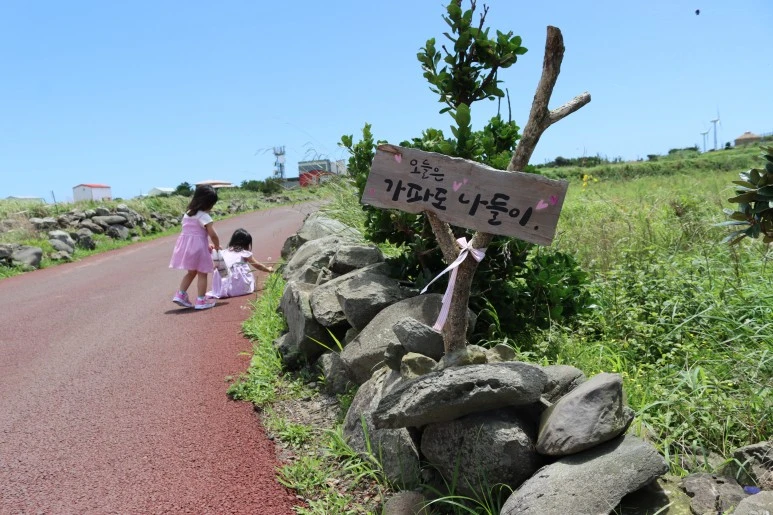가파도는 마라도에게 최남단 섬이라는 타이틀을 빼앗겨서 잘 알려지지 않았다. 하지만 우도나 마라도만큼이나 매력적인 섬이라는 것은 분명했다. 돌을 쌓으면서 소원을 비는 거라고 돌탑을 설명해 주고 얼마 지나지 않아 다율이가 커다란 돌을 발견하고 쌓으려고 했다. 배도 부르고 대충의 목적을 달성하니 점점 여유가 생겼다. 이때부터 아이들과 여유 있게 웃으며 보낼 수 있었던 듯하다. 아이들이 갑자기 미친 듯 전력질주를 시작한다. 말릴 틈도 없이 아이들은 깔깔거리며 엄청나게 빠르게 바닷가로 달려갔다. 차가 많이 다니지 않은 곳이라 안심하고 아이들이 마음껏 뛰어놀 수 있게 놔두었다. 여행을 마무리 지을 때쯤 되니, 다율이는 에너지가 넘쳐나기 시작했다. 하율이는 계속해서 졸리다고 한다. 아이들이 컨디션이 좋을 때 왔으면 정말 좋았을 것 같다는 생각이 들었다. 도착했던 선착장에서 아이들과 바다를 보며 놀고 있었다. 나중에는 땅바닥에 엎드리기도 하고 눕기도 했는데 그냥 두었다. 저 멀리서 배가 온다. 마치 표류되어 있던 로빈슨 크로스가 구조선을 만난 것처럼 기쁘다.