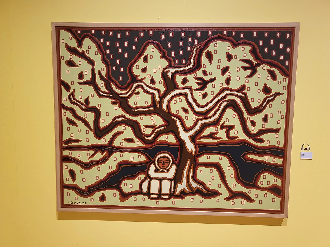 굵은 선과 선명한 색감으로 시원시원하게 표현된 그림을 보면 역시 즐거움이 솔솔 든다. 그리고 뒤뷔페처럼 '재미있다'라는 느낌이 들어올 때 신나고 '오늘 그림 감상도 잘 왔구나'라고 느낀다. 호랑이 그림이나 주몽 그림, 그리고 윤동주의 서시나 박목월의 시를 읽고 느낀 것을 그림으로 표현한 것들도 재밌다. 그런데 김소월의 시를 읽고 그린 그림을 보고 있는데 안내하는 분이 와서 갑자기 설명을 해 줬다. '산수갑산 가는 길' 을 사람들이 좋다고 하며 사겠다는 사람들이 있다고. 근데 난 그 그림이 설명 듣기 전부터 무서운 느낌이 들어서 자세히 보지 않았던 그림이다. 제목도 보기 전에. 아, 내 느낌이 맞구나. 뭔가 힘들어 보이는 분위기의 그림이었다. 어두운 배경에 흰 눈이 내리고 산을 배경으로 사람이 앉아 있다. 그냥 딱 봐도 힘들어 보인다.